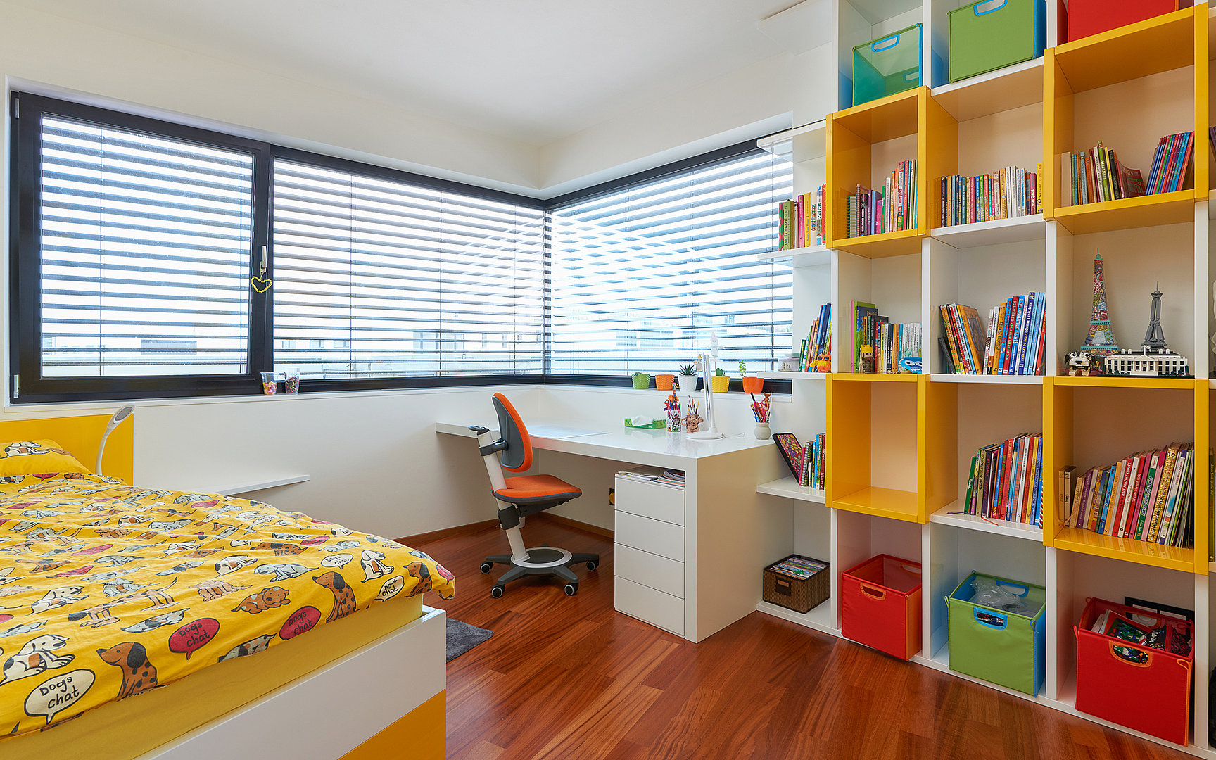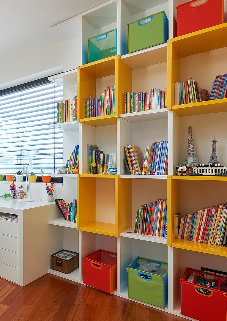 ktorá vďaka svojmu farebnému vyhotoveniu dominuje tejto izbe, poslúži na uloženie kníh, hier, hračiek alebo obľúbených talizmanov.