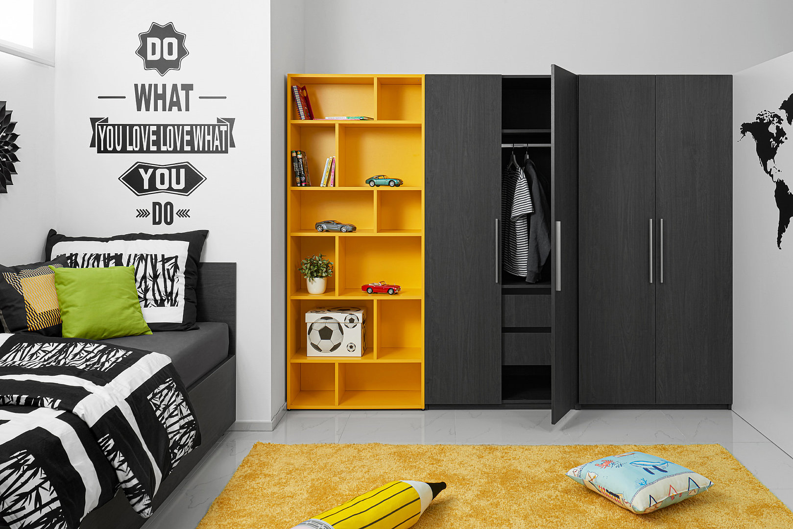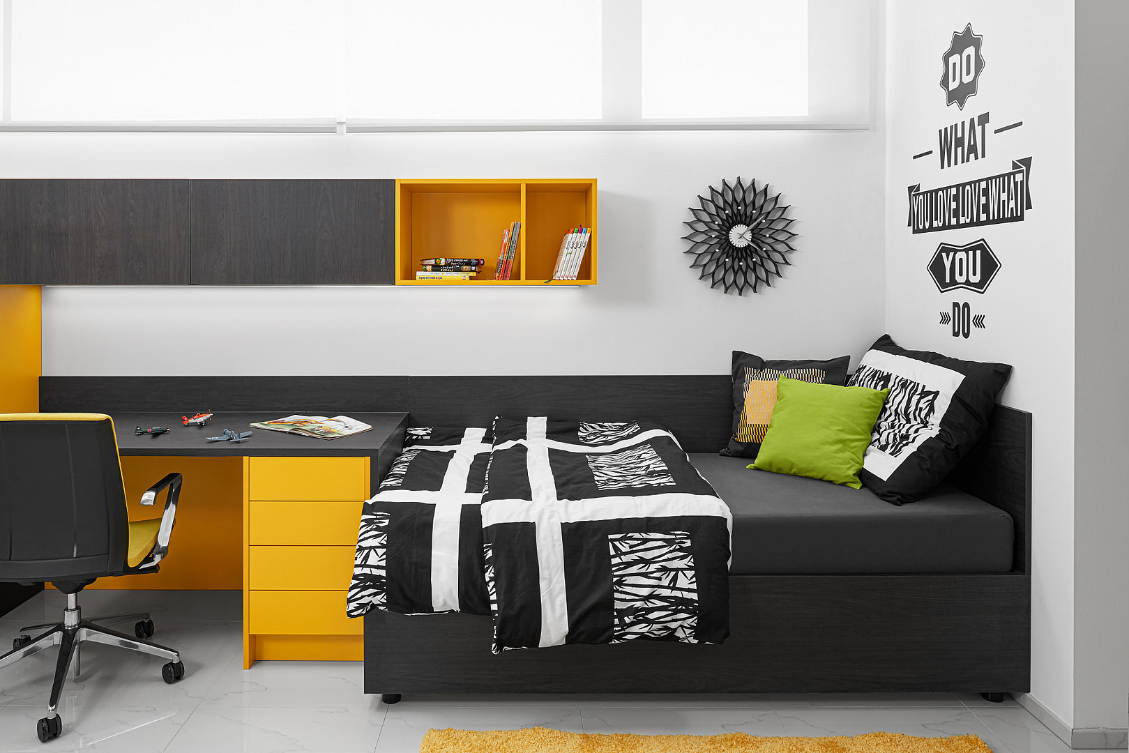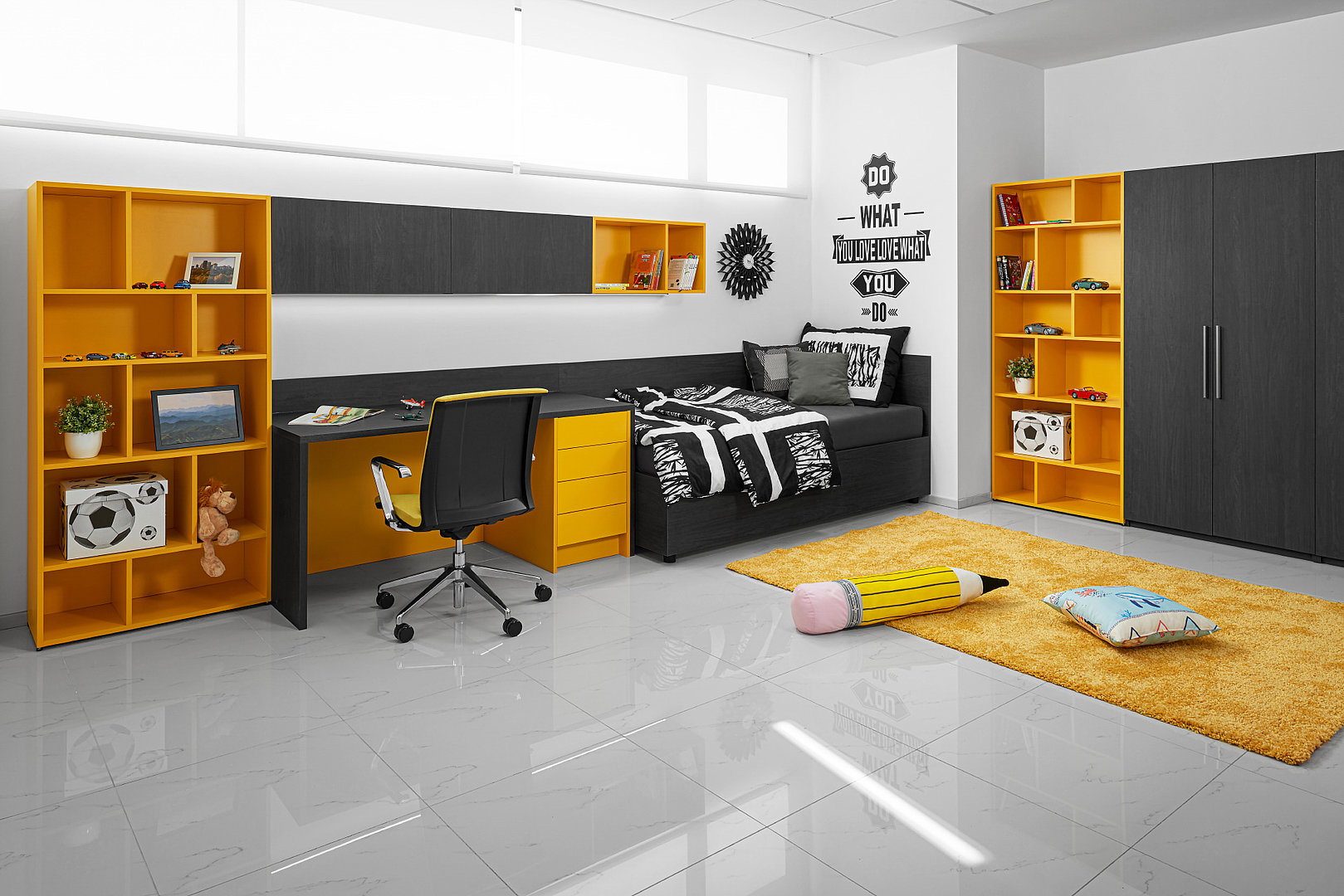 Izba pre dospievajúce deti vo výraznej farebnej kombinácii s množstvom úložného priestoru.