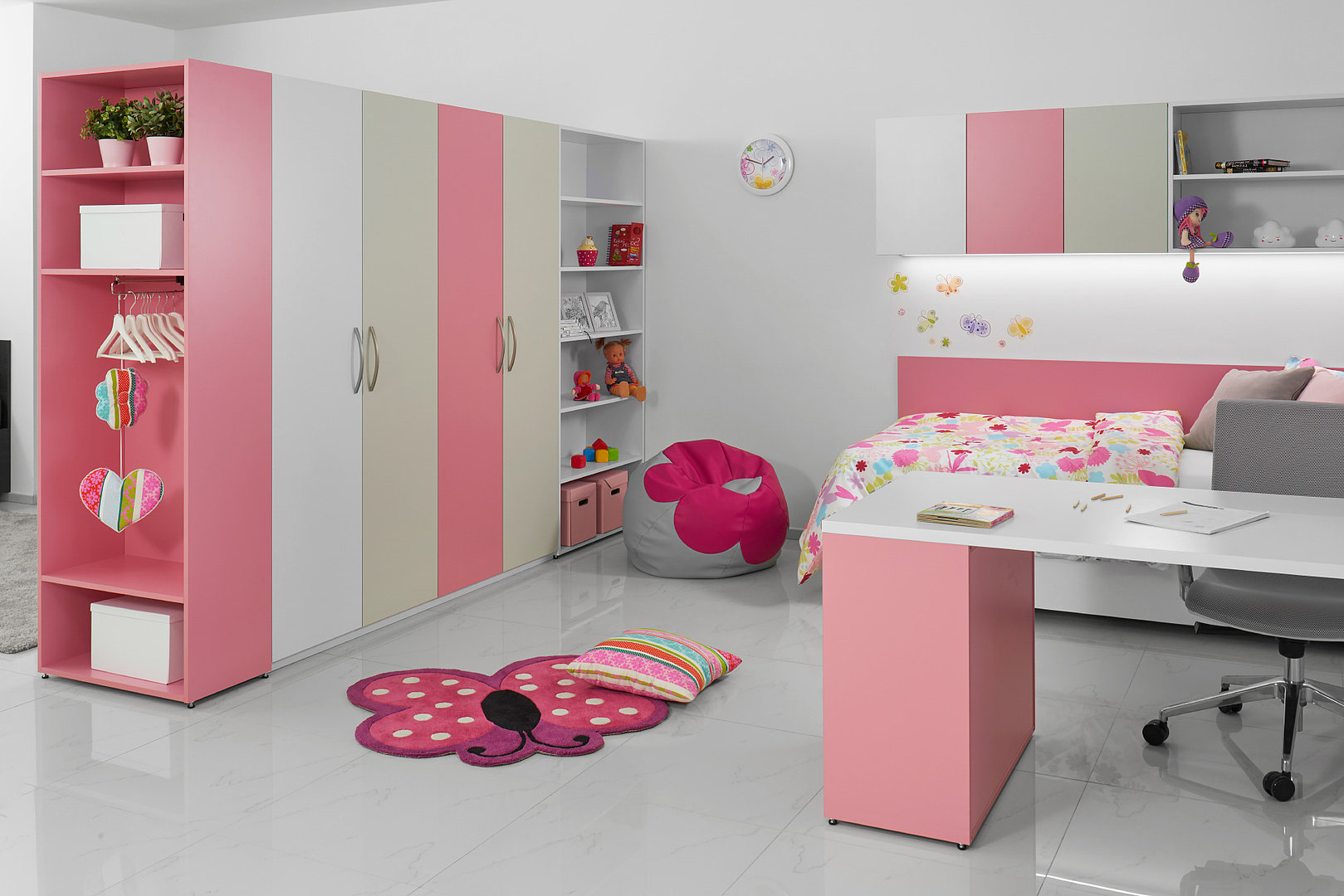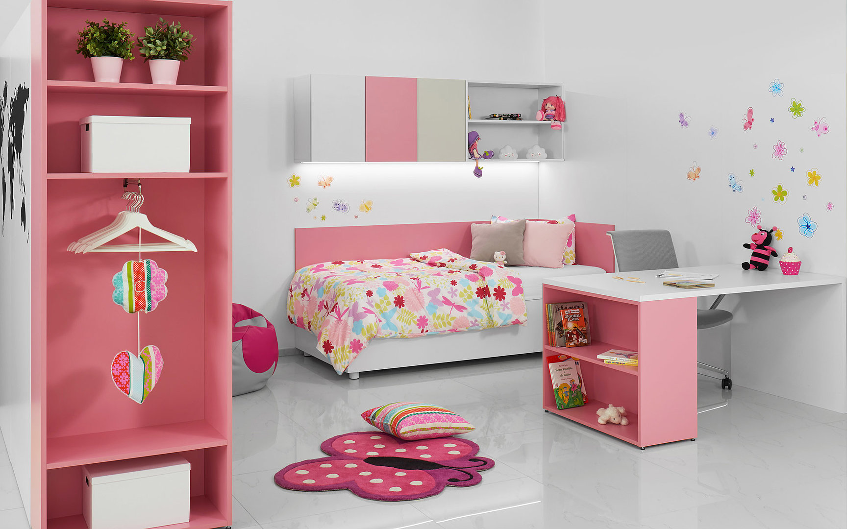 Kráľovstvo pre malé princezné v tlmených farebných odtieňoch matného laku. Nechýba šatníková skriňa na šaty, otvorené niky na hračky a pohodlná posteľ na kvalitný spánok.