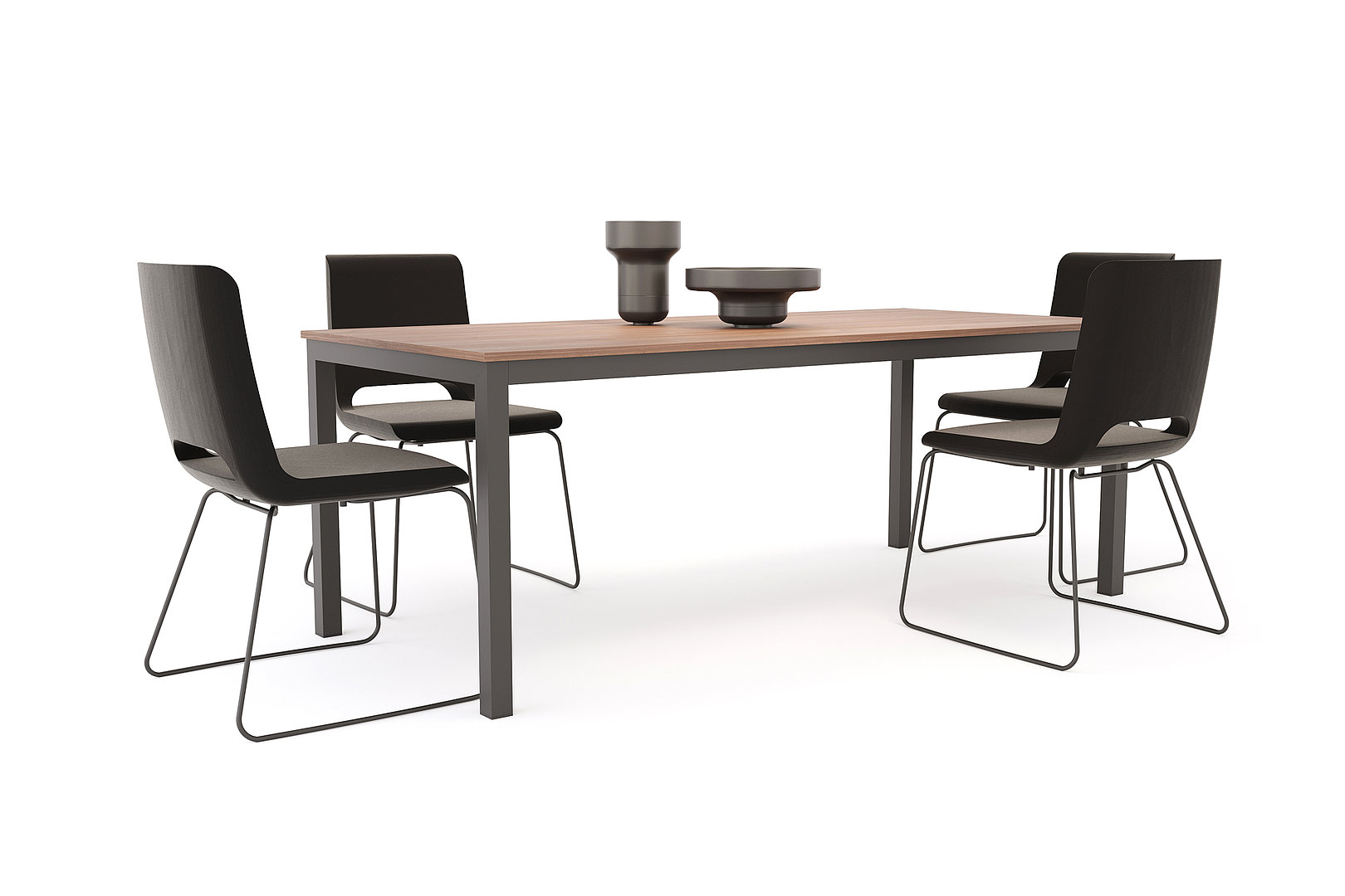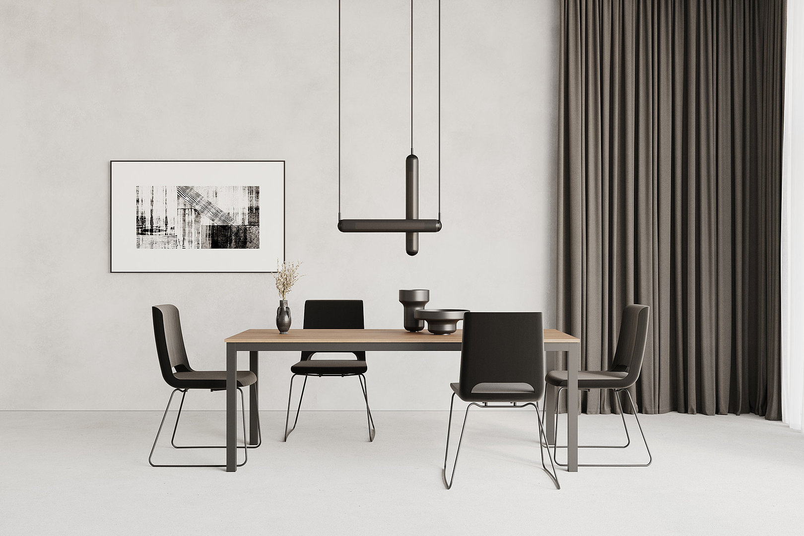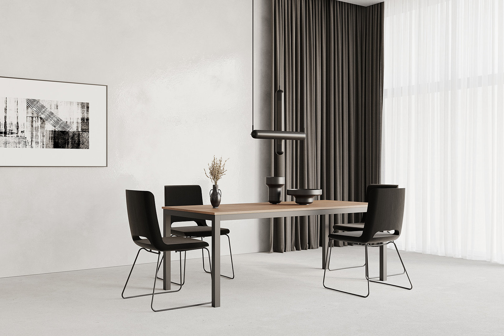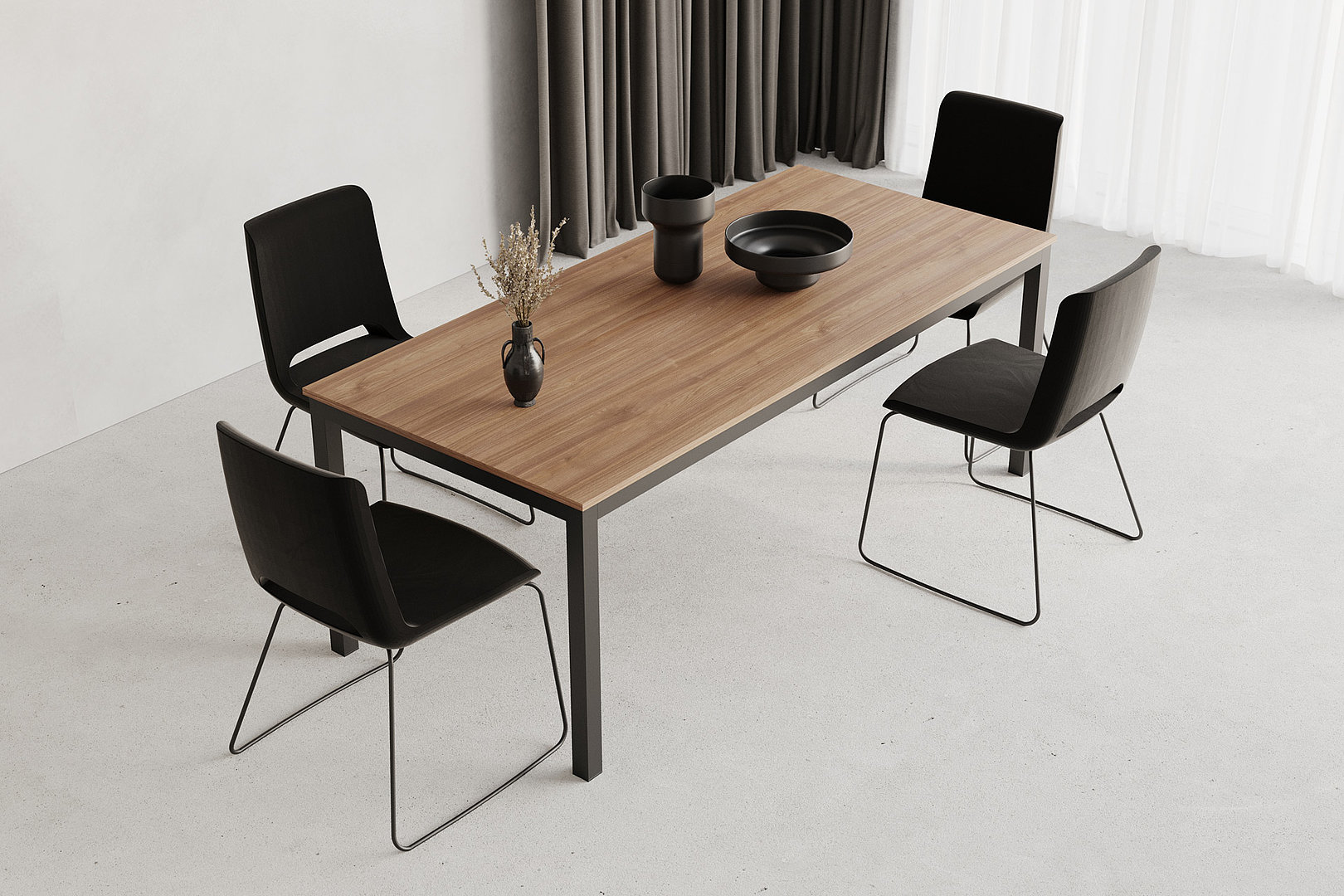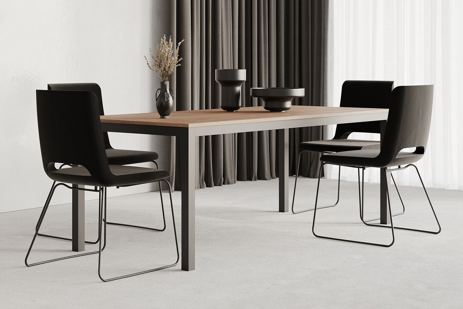 Prepojenie kovu s drevom, lakom alebo drevodekorom dodáva interiéru určitú eleganciu a ľahkosť. Jedálenský stôl s kovovou podnožou s možnosťou rozličných farebných variantov.