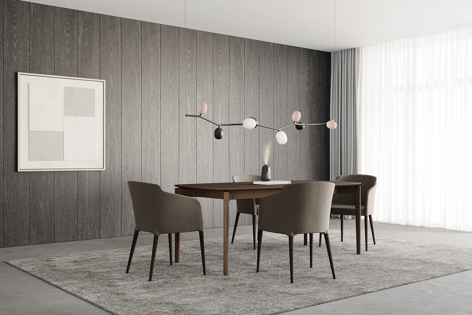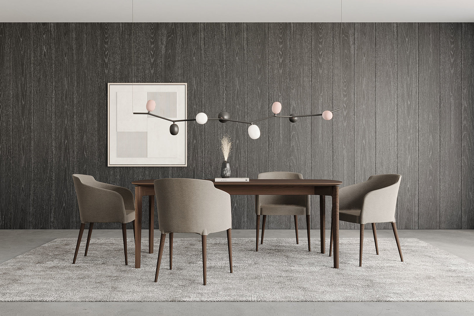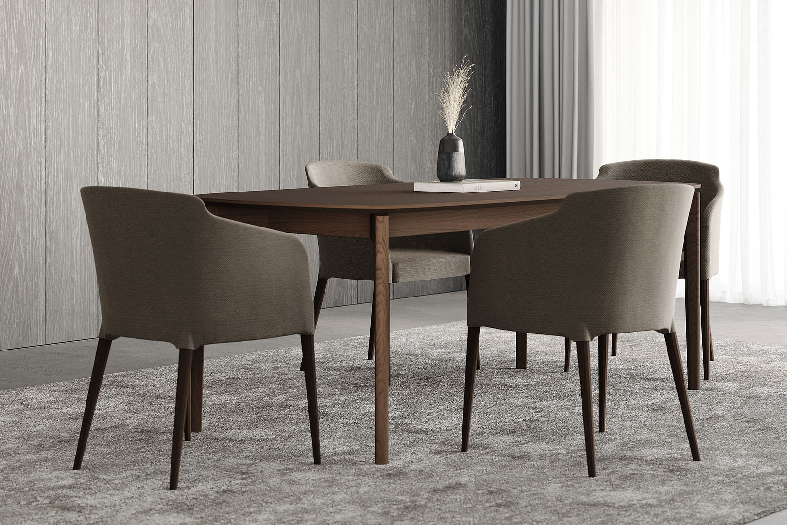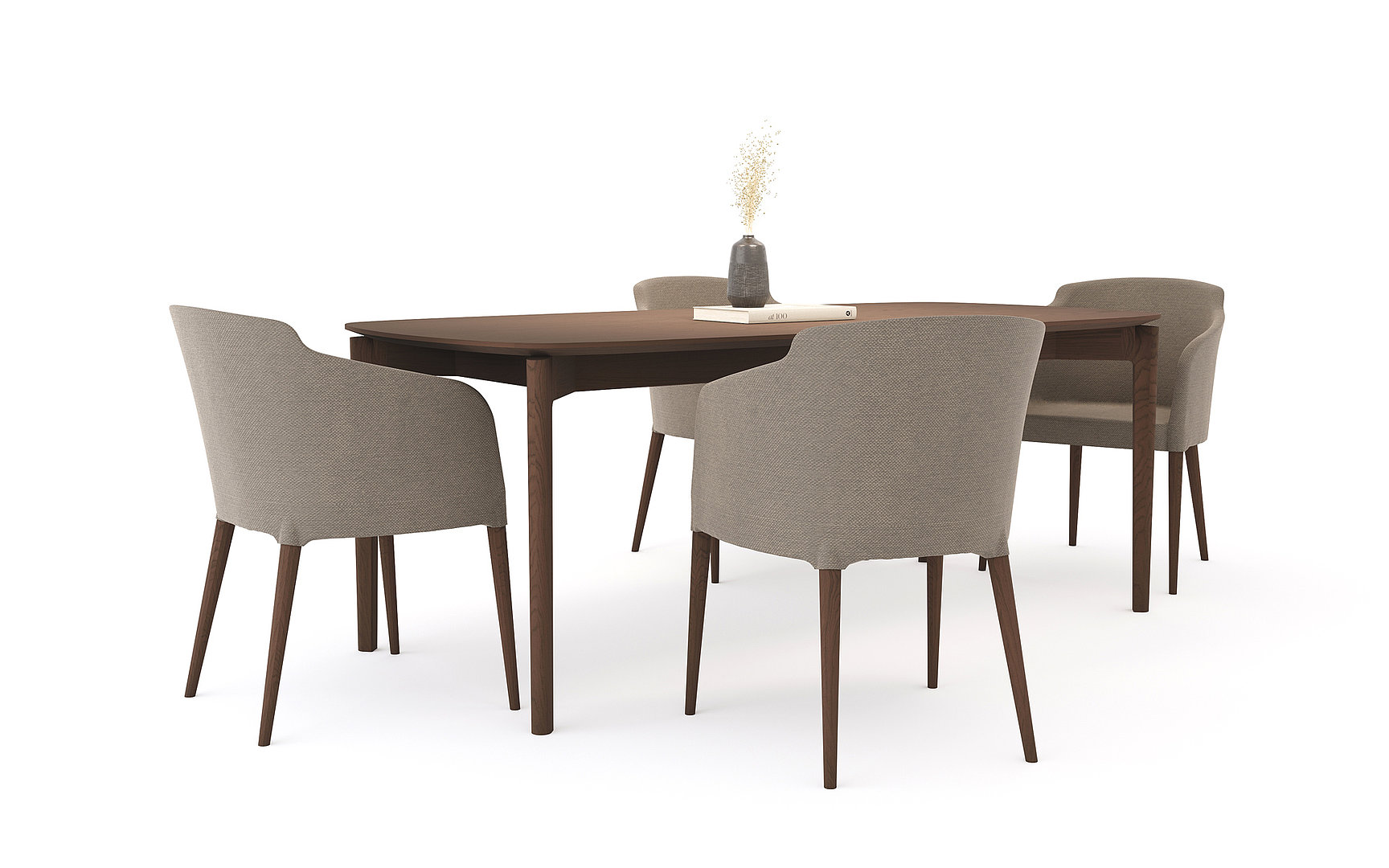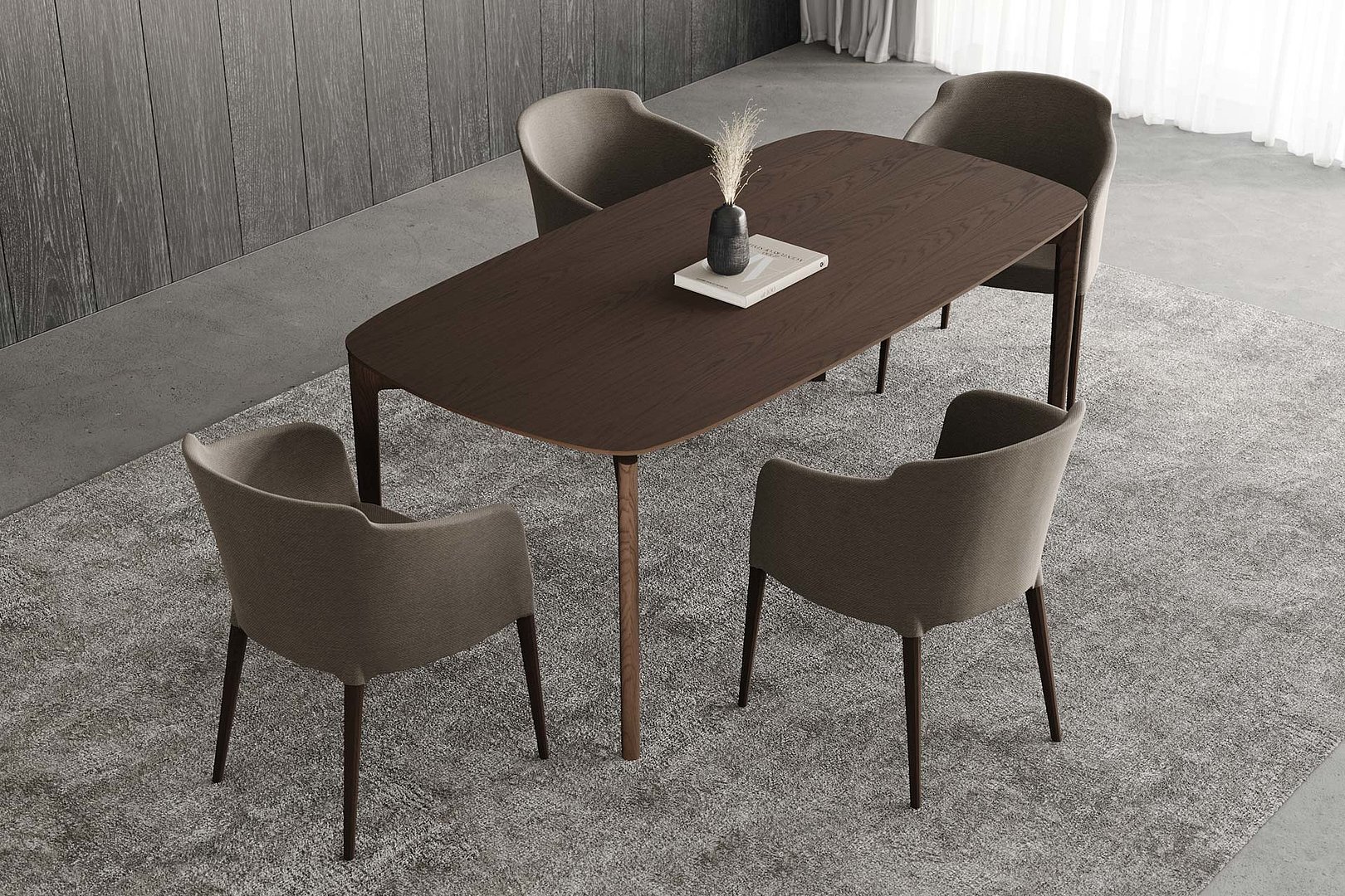 Obdĺžnikový jedálenský stôl so zaoblenými rohmi stolovej dosky s decentným skosením a remeselným spracovaním nôh s napojením na lub. Kombinácia týchto prvkov vzbudzuje dojem elegancie a odľahčenosti.