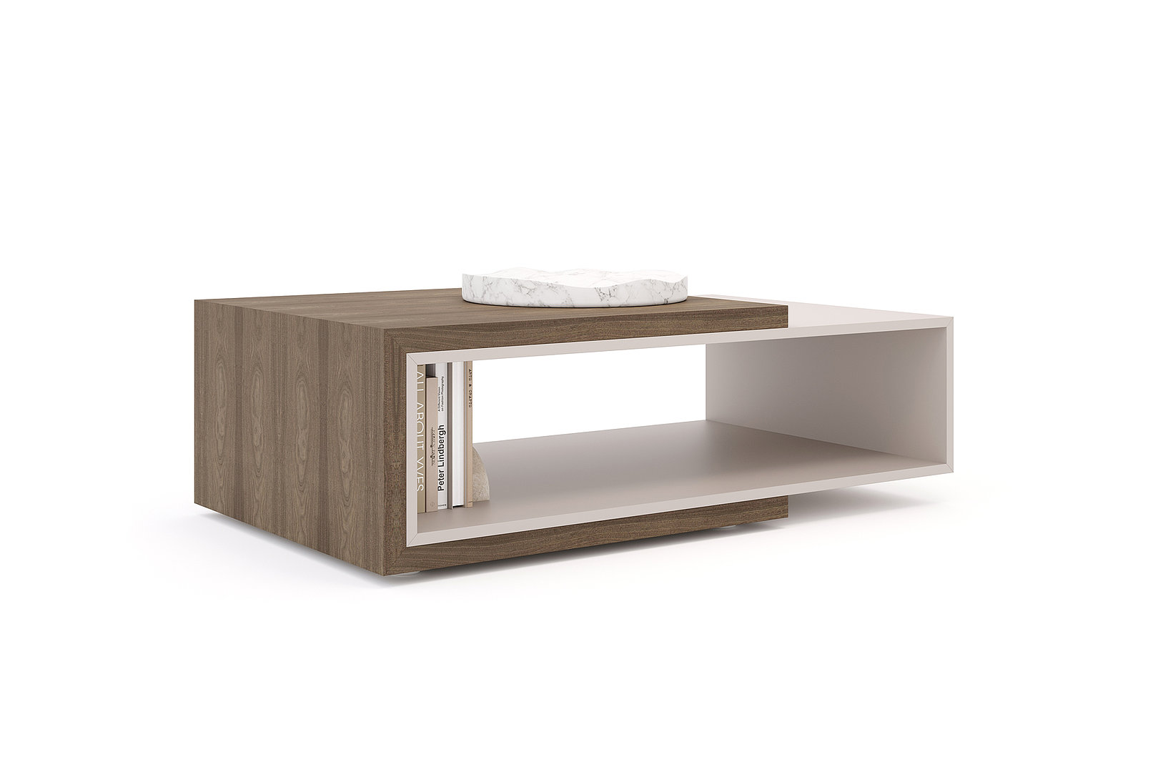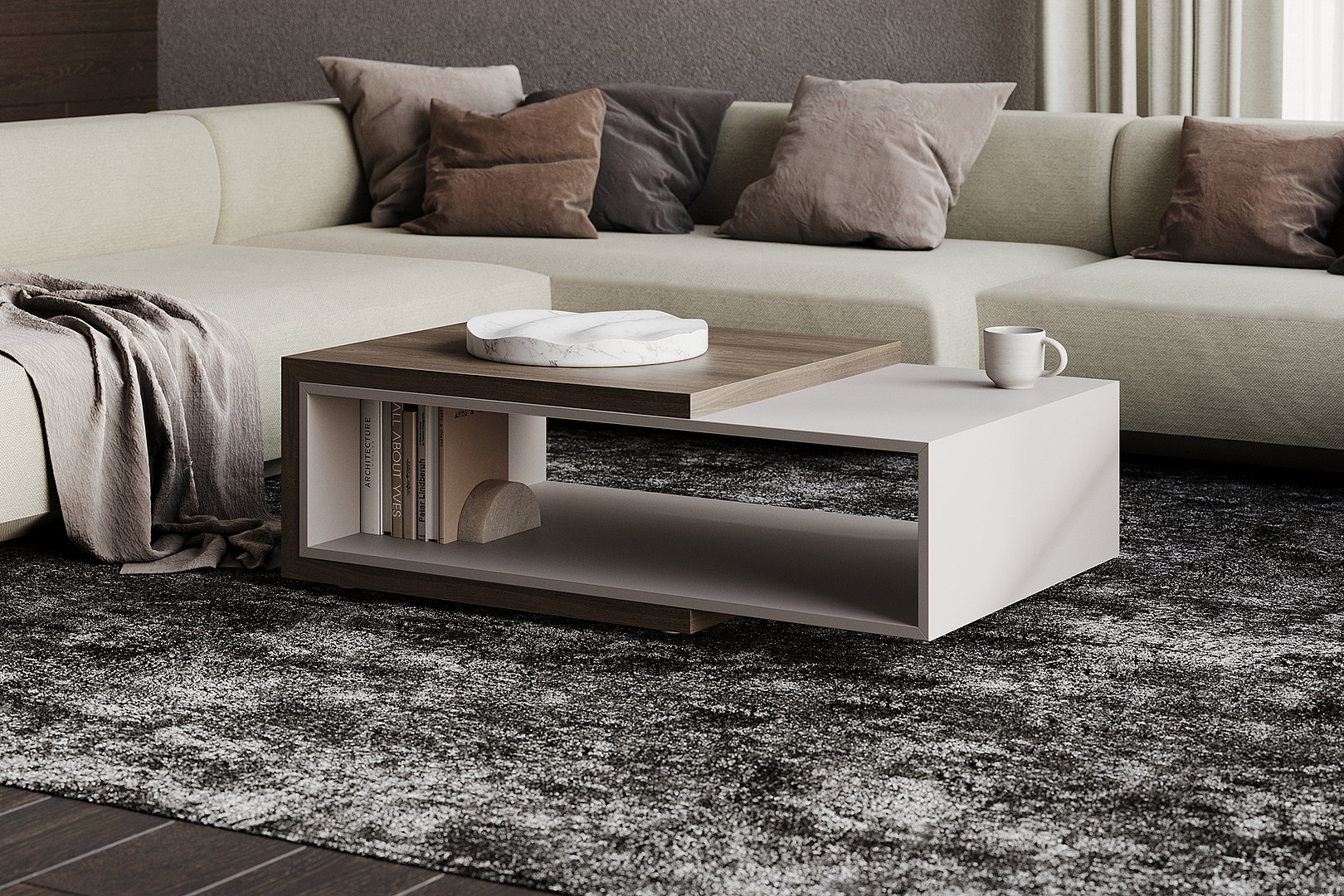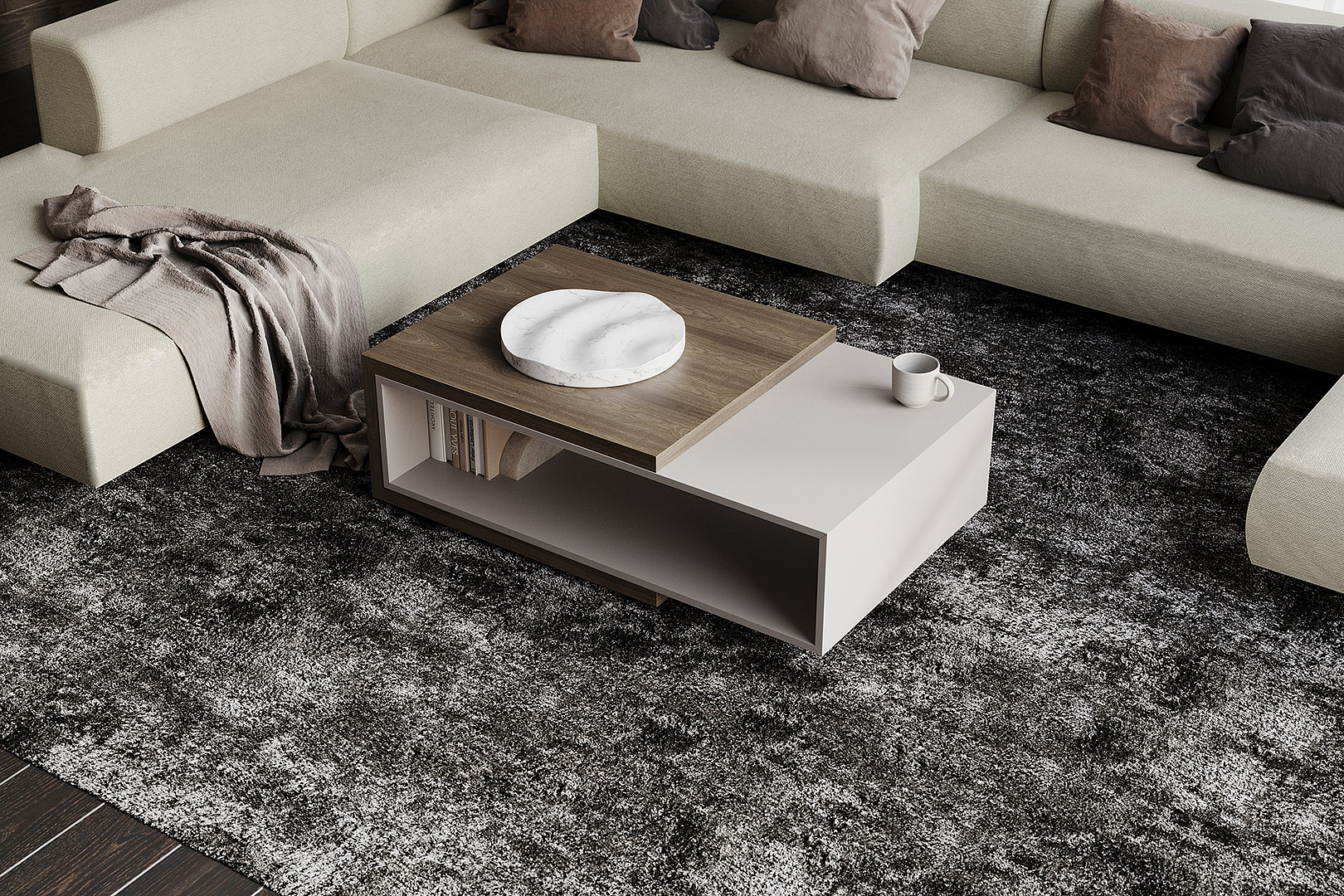 Konferenčný stolík zložený z dvoch obdĺžnikov navodzuje vďaka zaujímavému poskladaniu pocit, že jeho väčšia časť levituje.