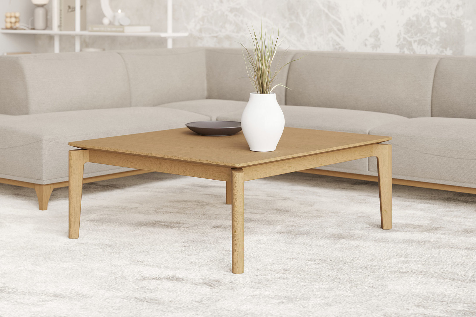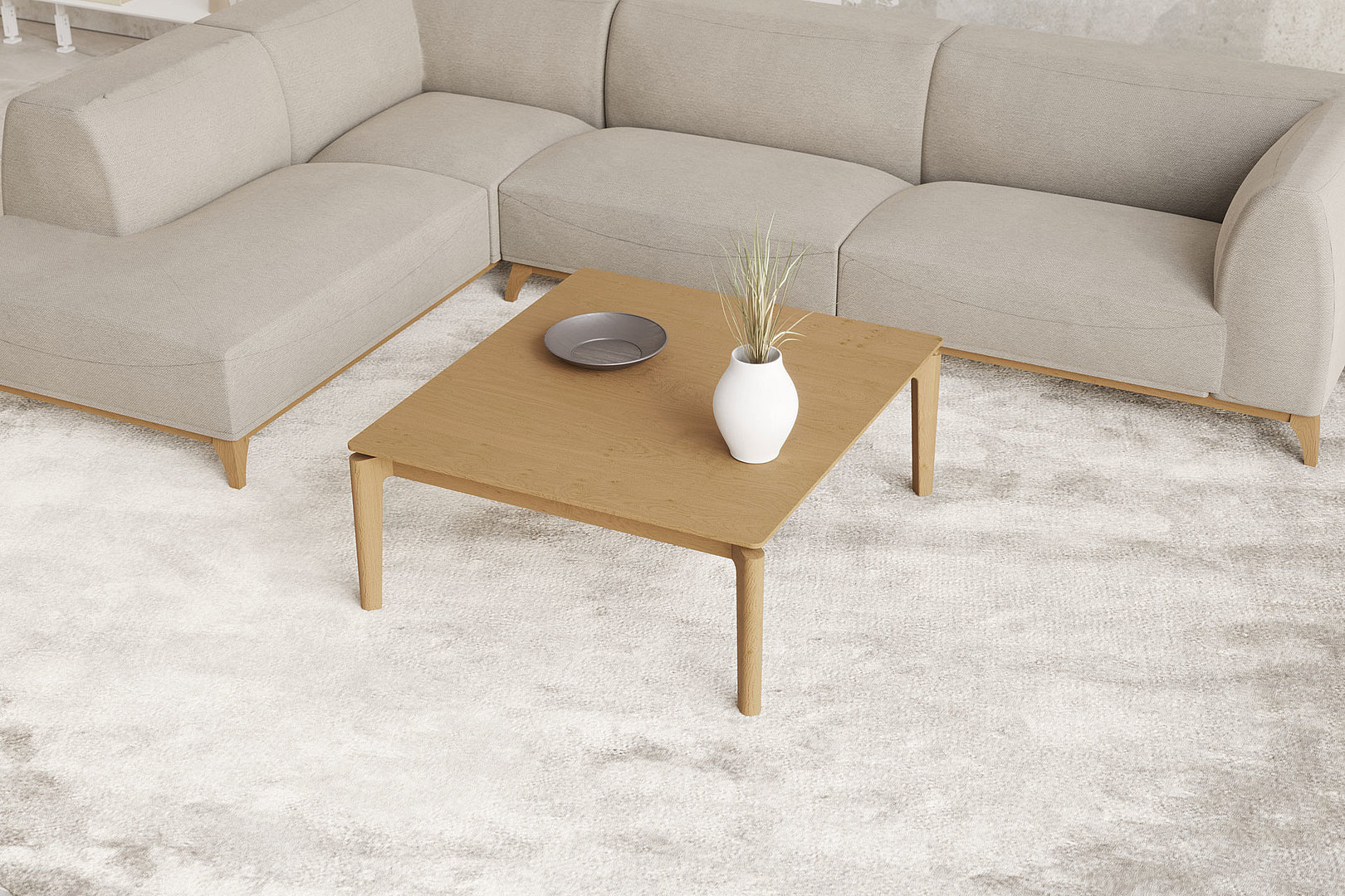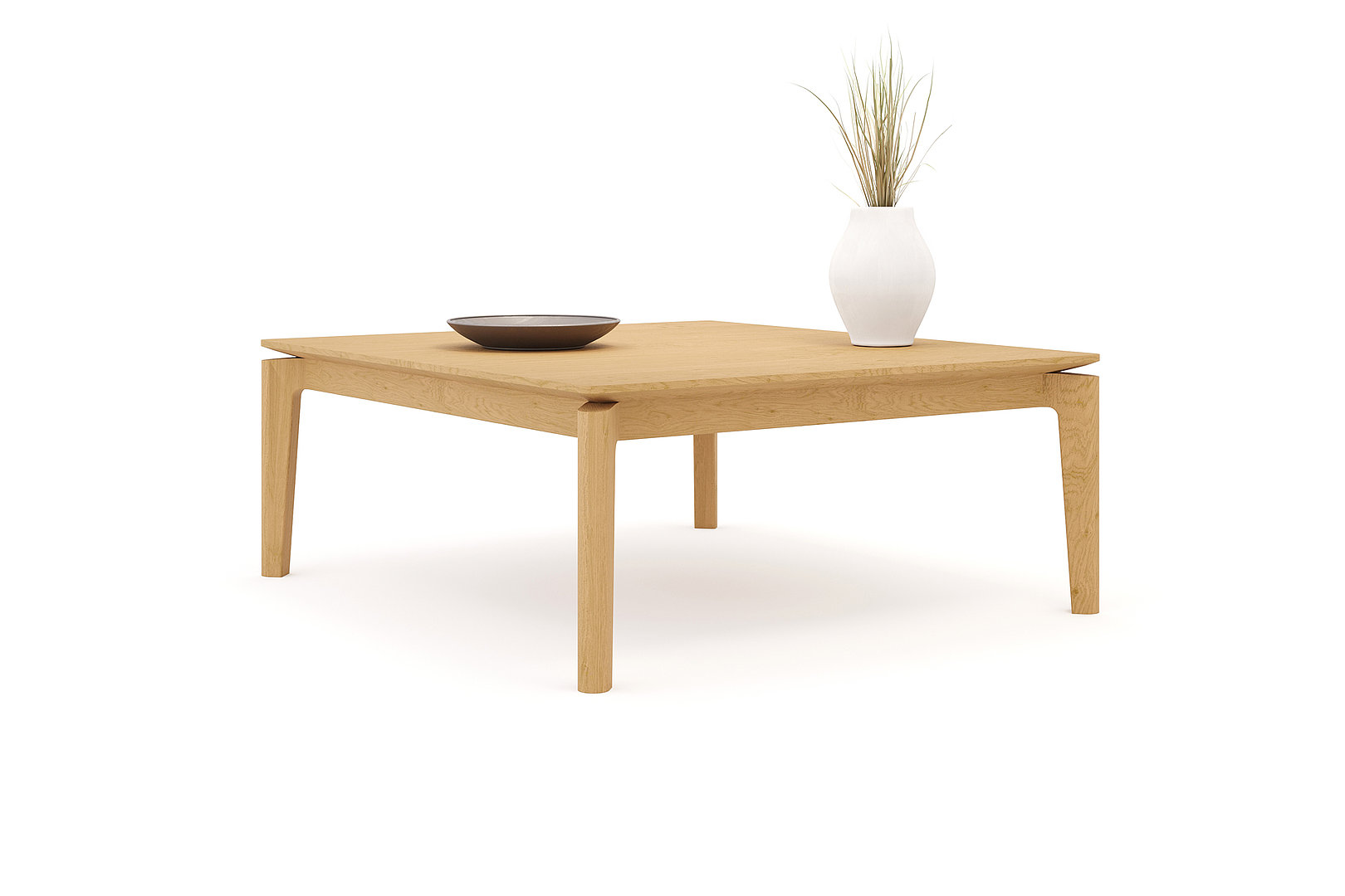 Konferenčný stolík s remeselným spracovaním nôh a so skosením stolovej dosky, ktorá vďaka tomu pôsobí subtílnym dojmom.