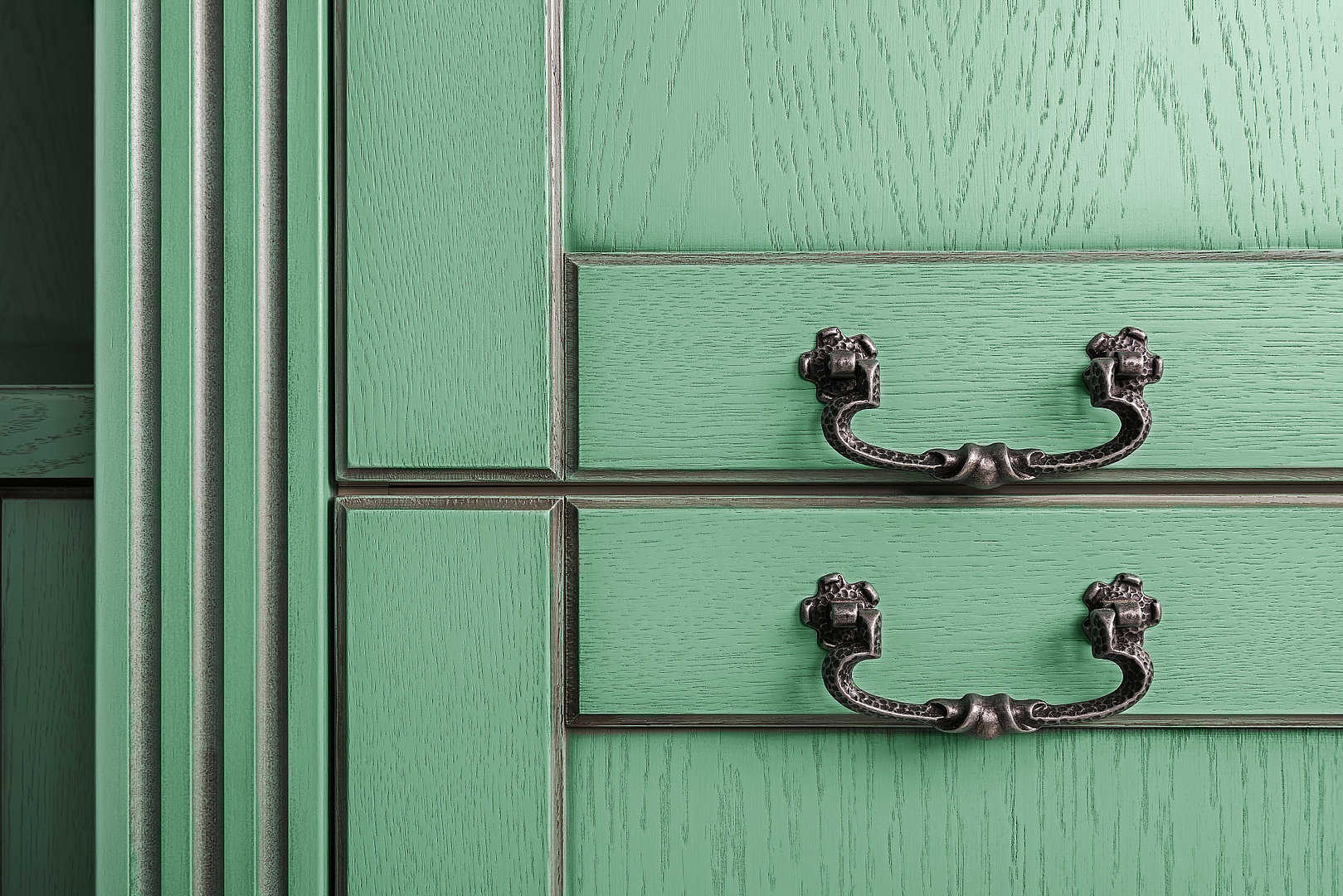 Zaujme aj detail úchytky a patina, ktorá je veľmi ozdobná a zdôrazňuje romantickú tvár kuchyne.