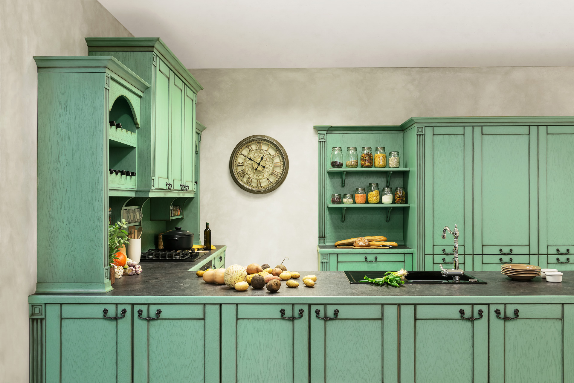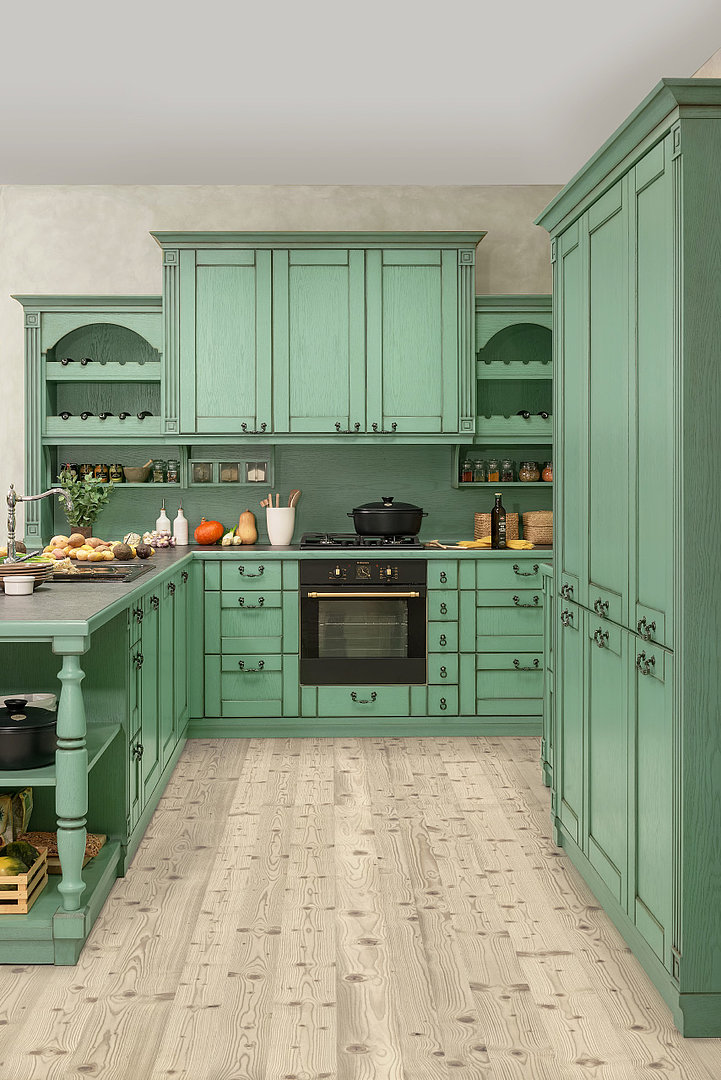 Táto štýlová kuchyňa je hravá vo svojich detailoch. Elegantné dvierka, ozdobné stĺpiky a ručná patina pridá na kráse a dojme starobylosti.