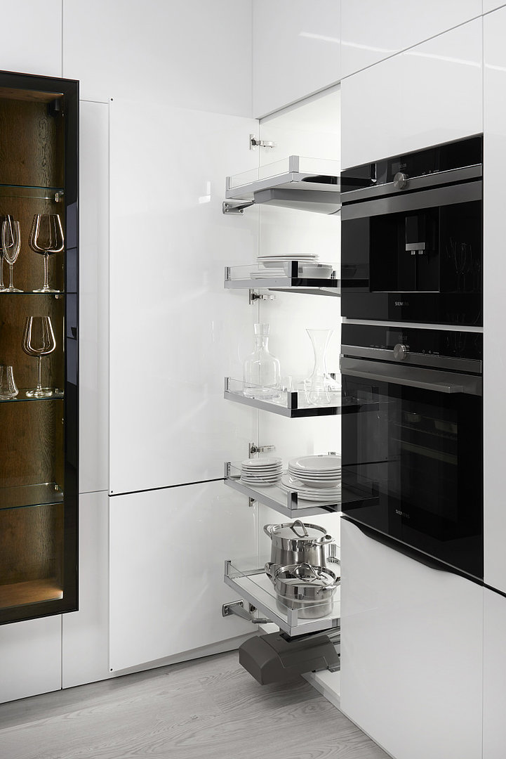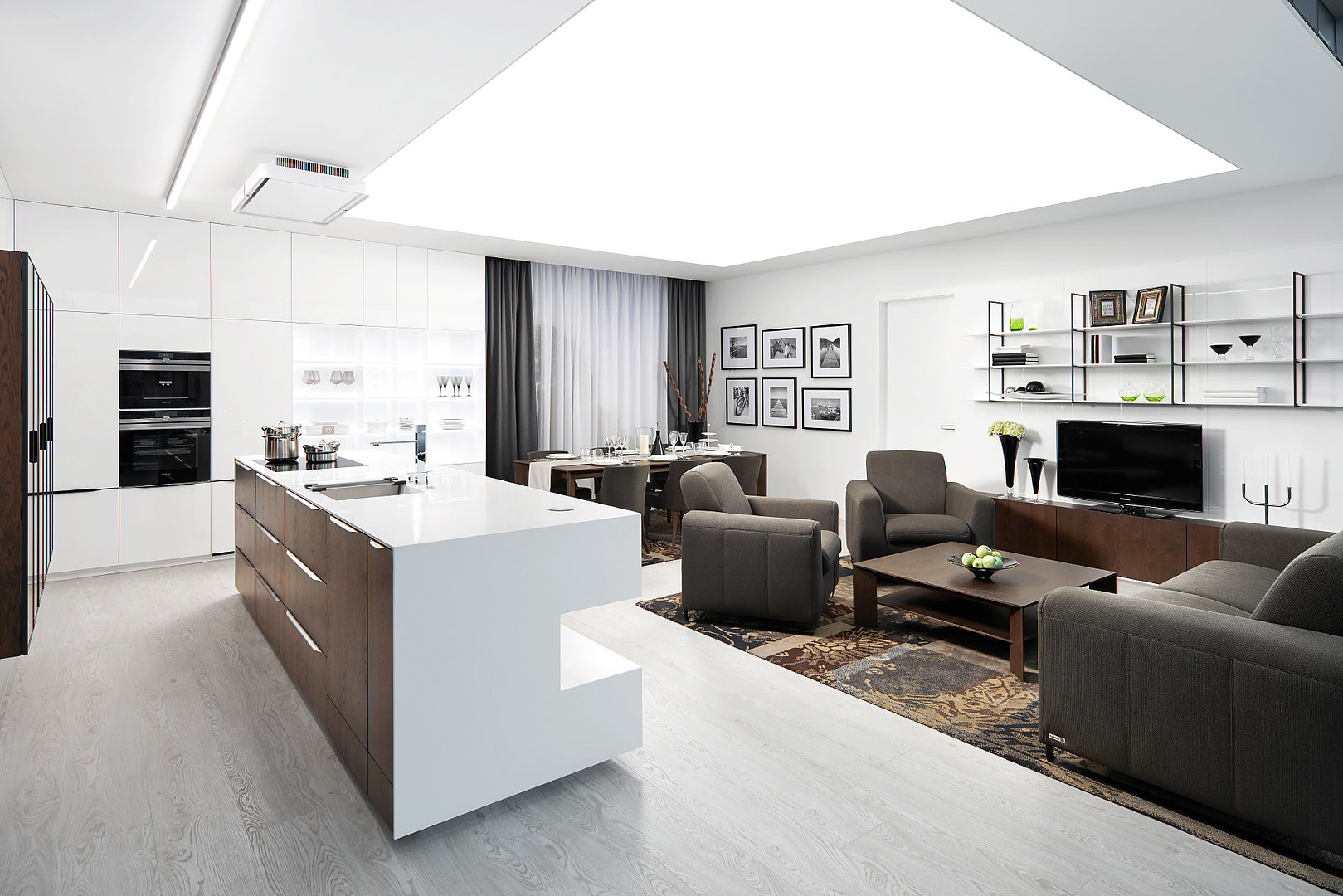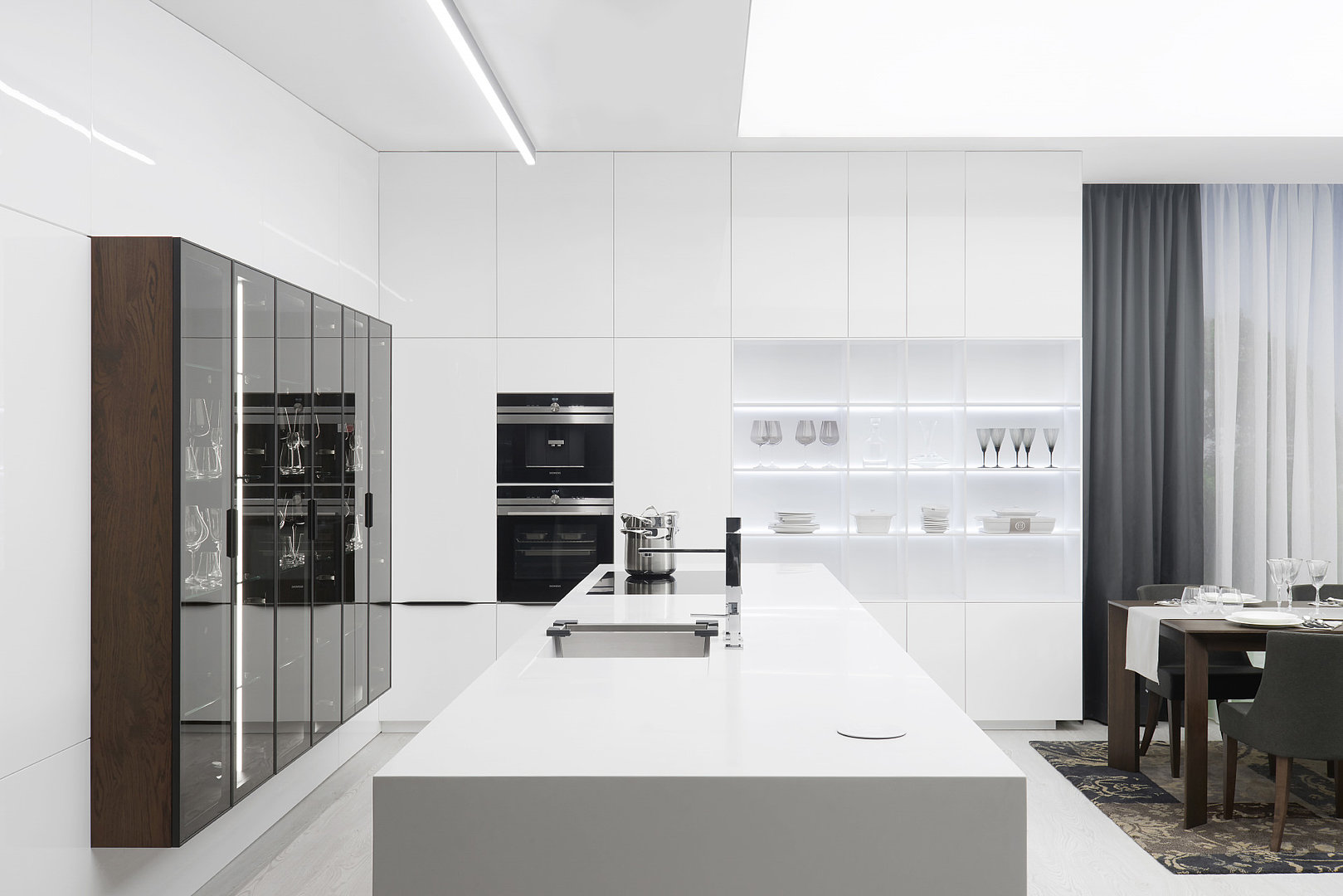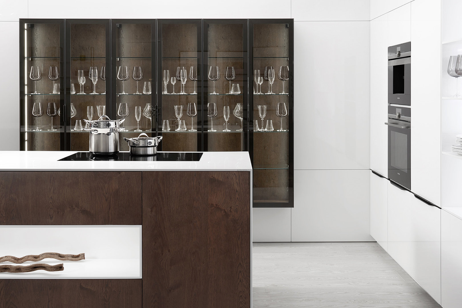 Skutočne luxusná dizajnová zostava kuchynského nábytku. To je kuchyňa COMFORT s bielym lesklým lakom s akcentom dyhy a dominantnou úchytkou.