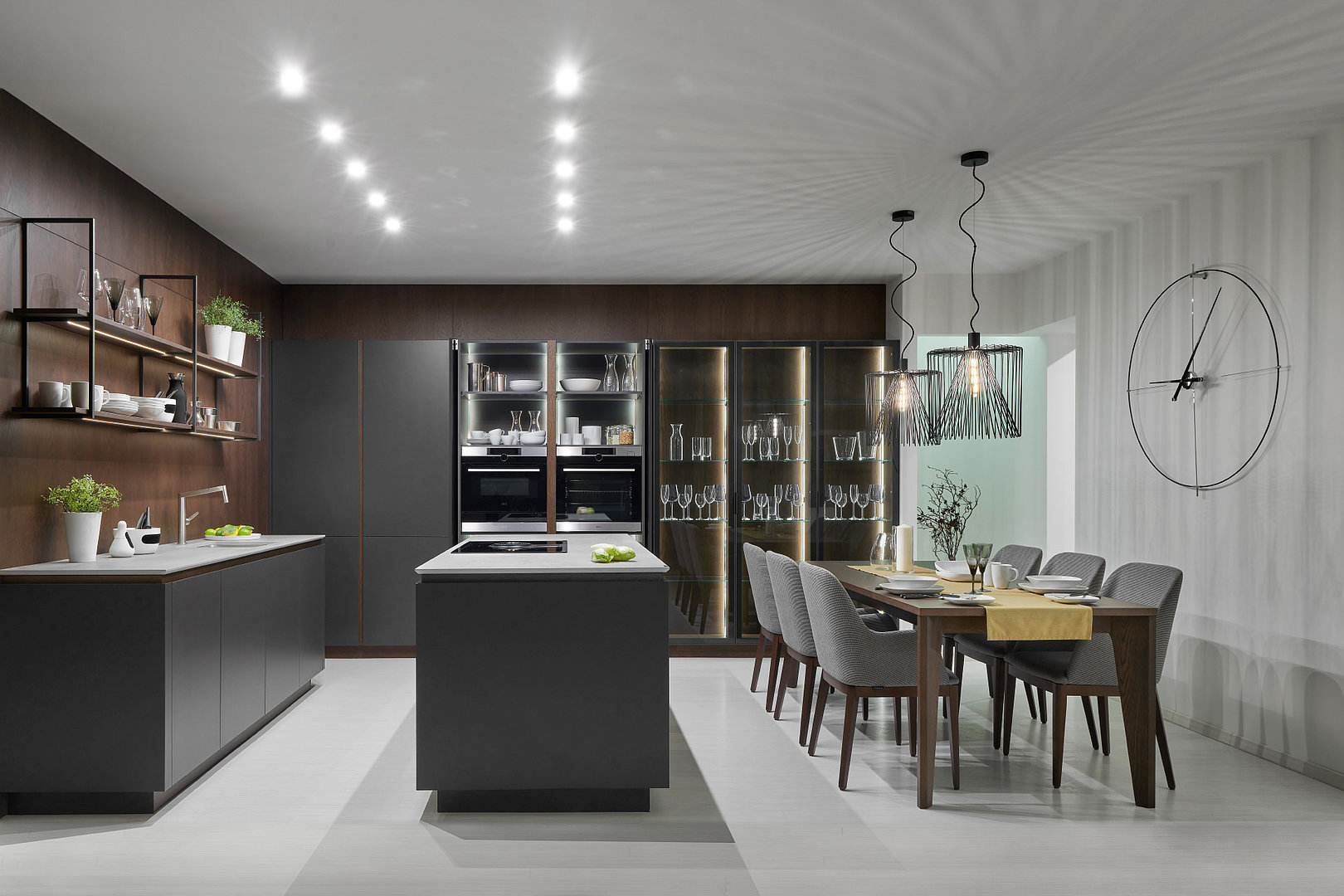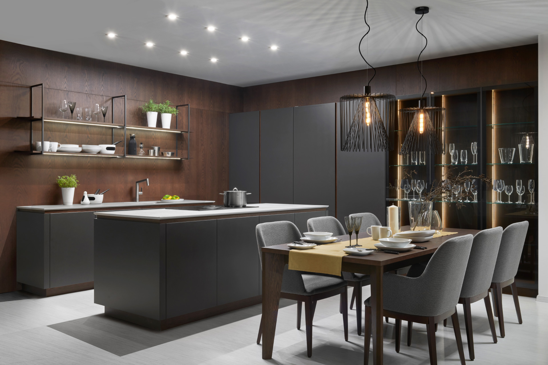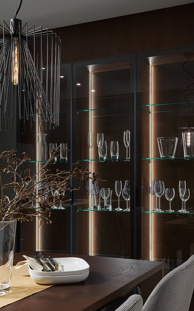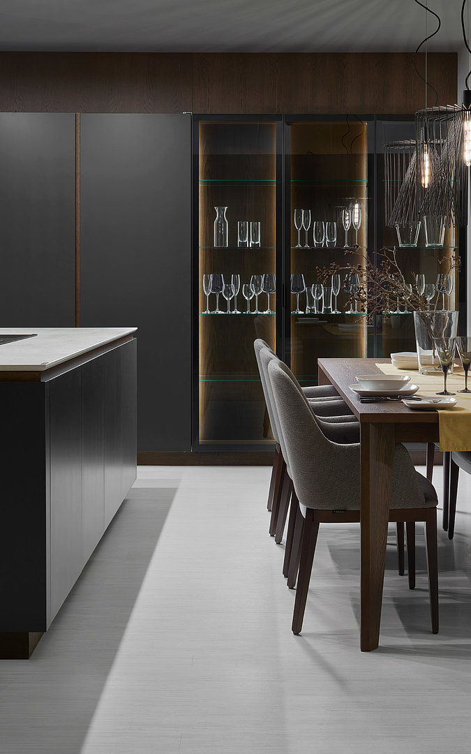 v rovnakom vyhotovení vrátane jedálenských stoličiek. Plné dvere s matným titánovým lakom odľahčuje presklená zostava a decentná závesná kovová konštrukcia na police.