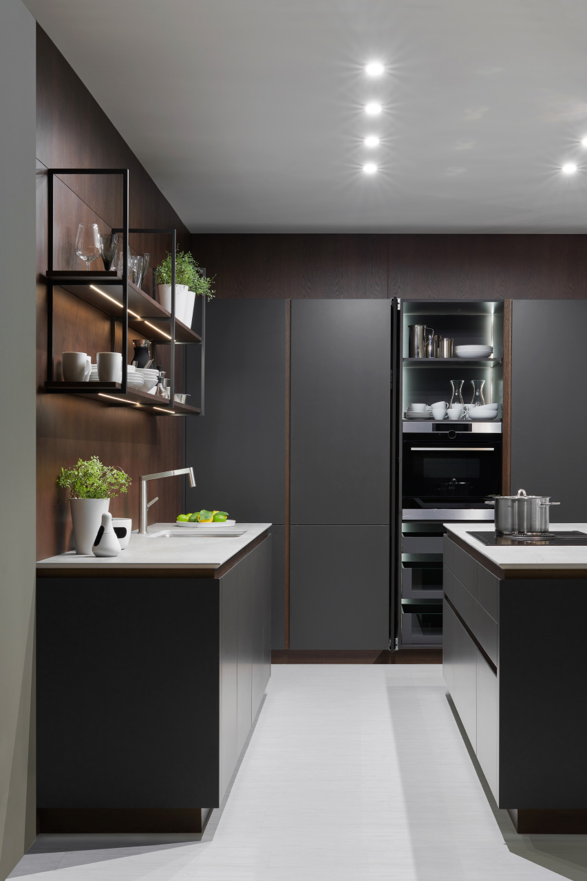 sú v tejto zostave dômyselne schované za zasúvacími dverami, a preto nenarúšajú minimalistický vzhľad kuchyne.