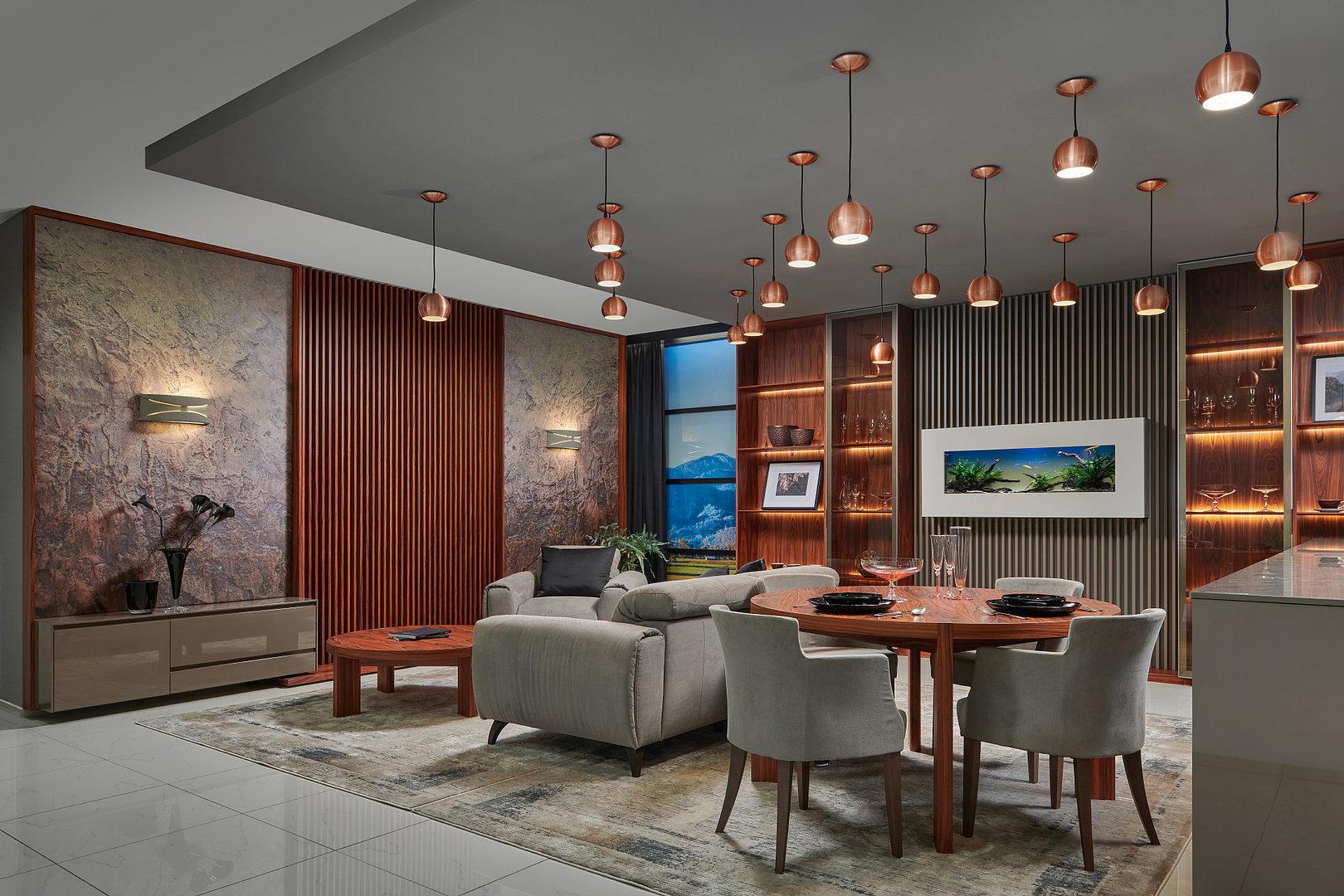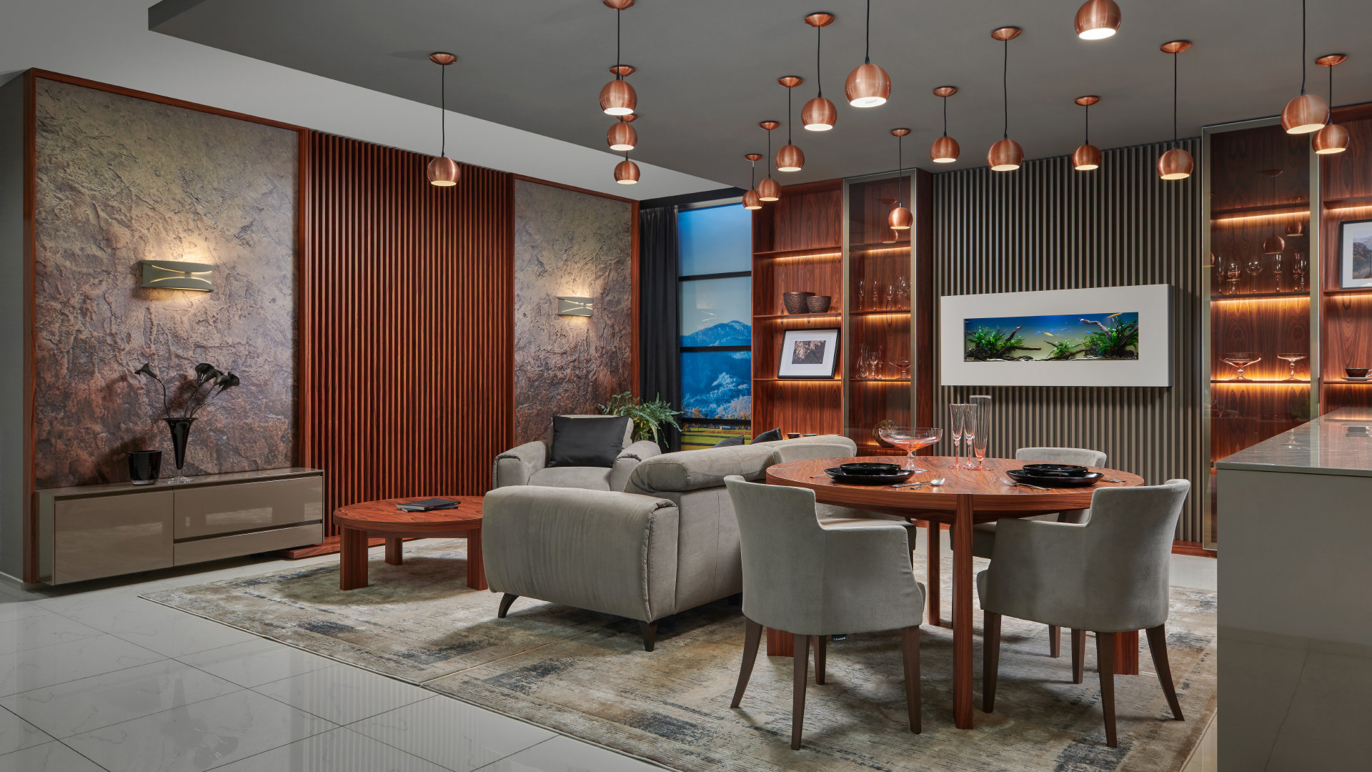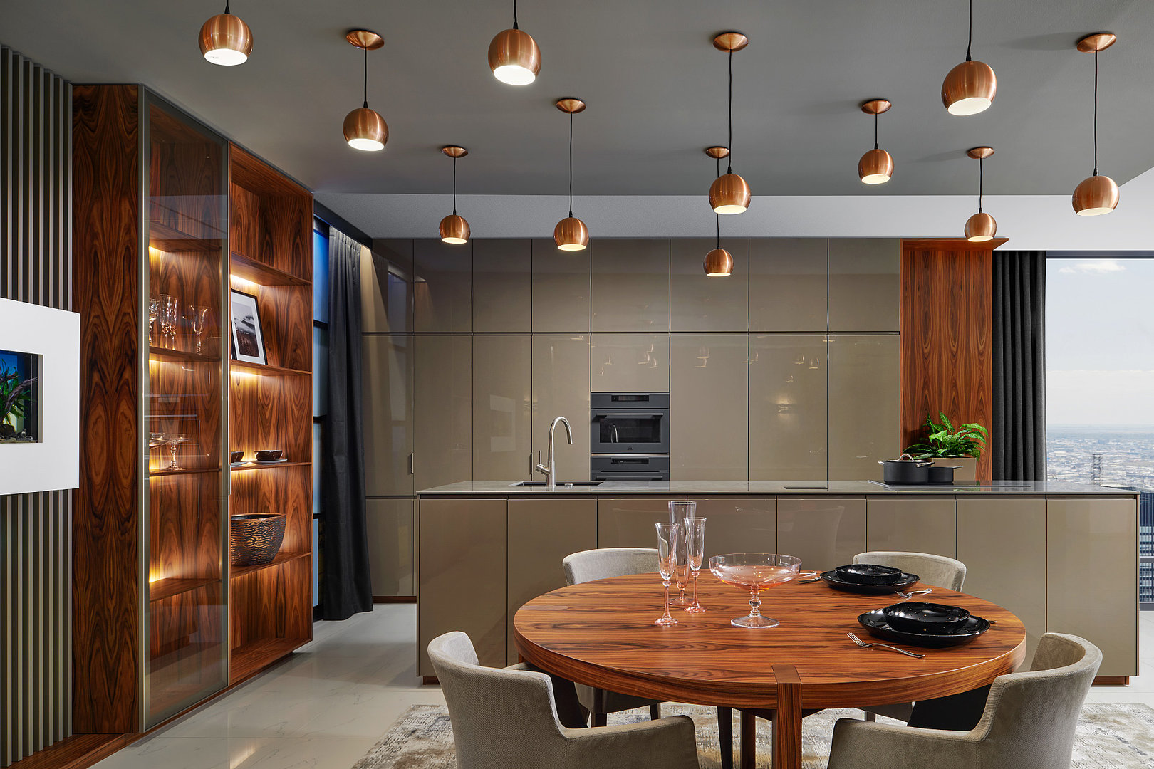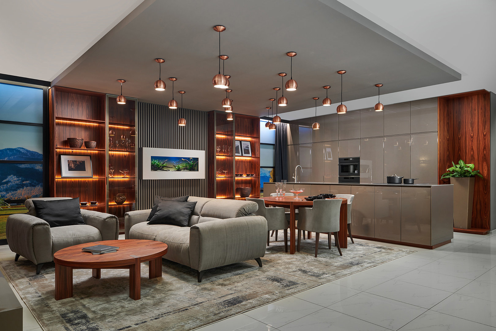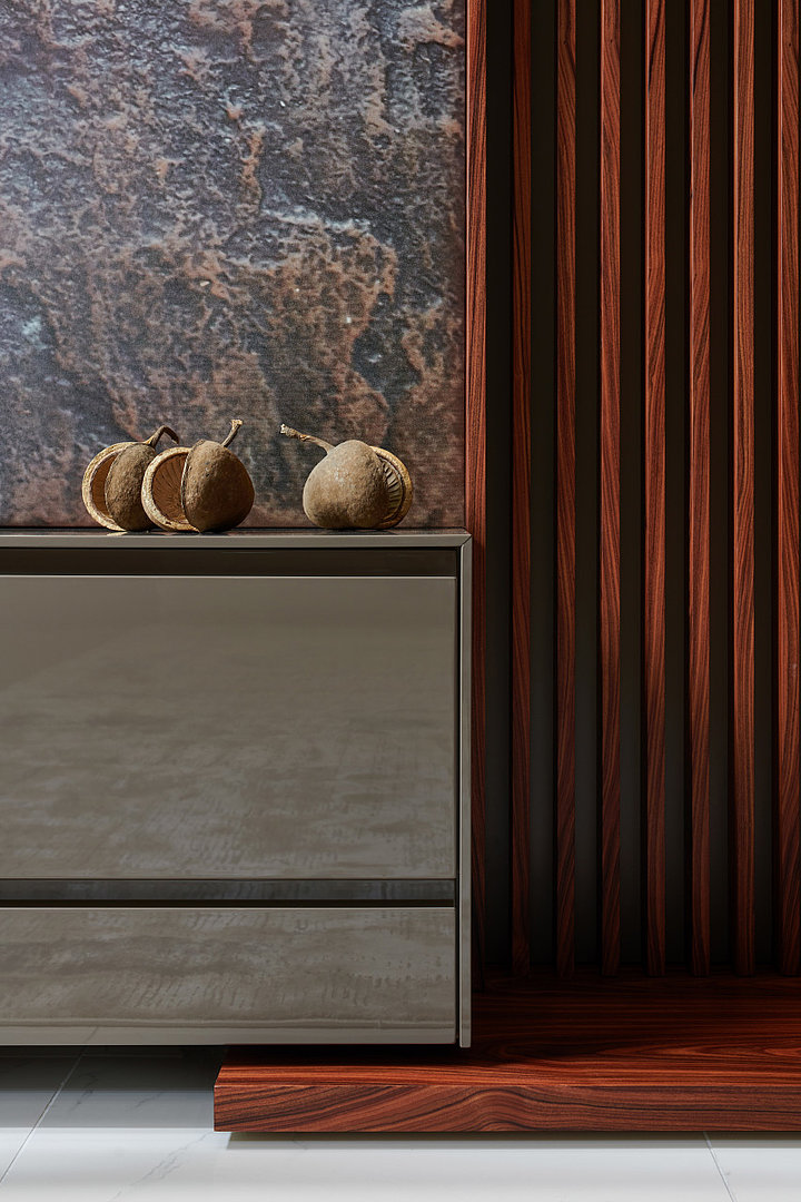 v kombinácii otvorených a presklených políc s ambientným podsvietením. Absolútna elegancia a jedinečnosť v interiéri.