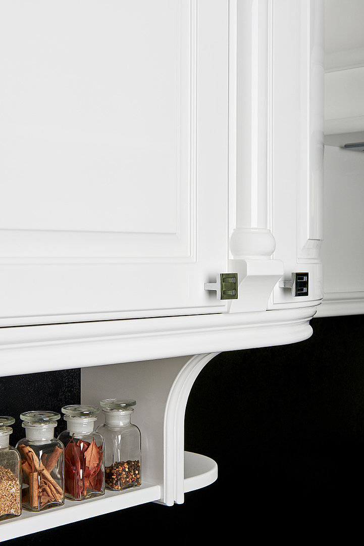 Koncové guľaté dvierka sú pre túto kuchyňu typické. Decentnou ozdobou sú aj jemné okrasné stĺpiky.