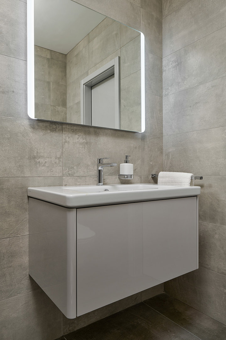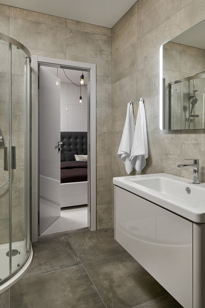 Kúpeľňa aj interiérové dvere v rovnakom lakovanom vyhotovení.
