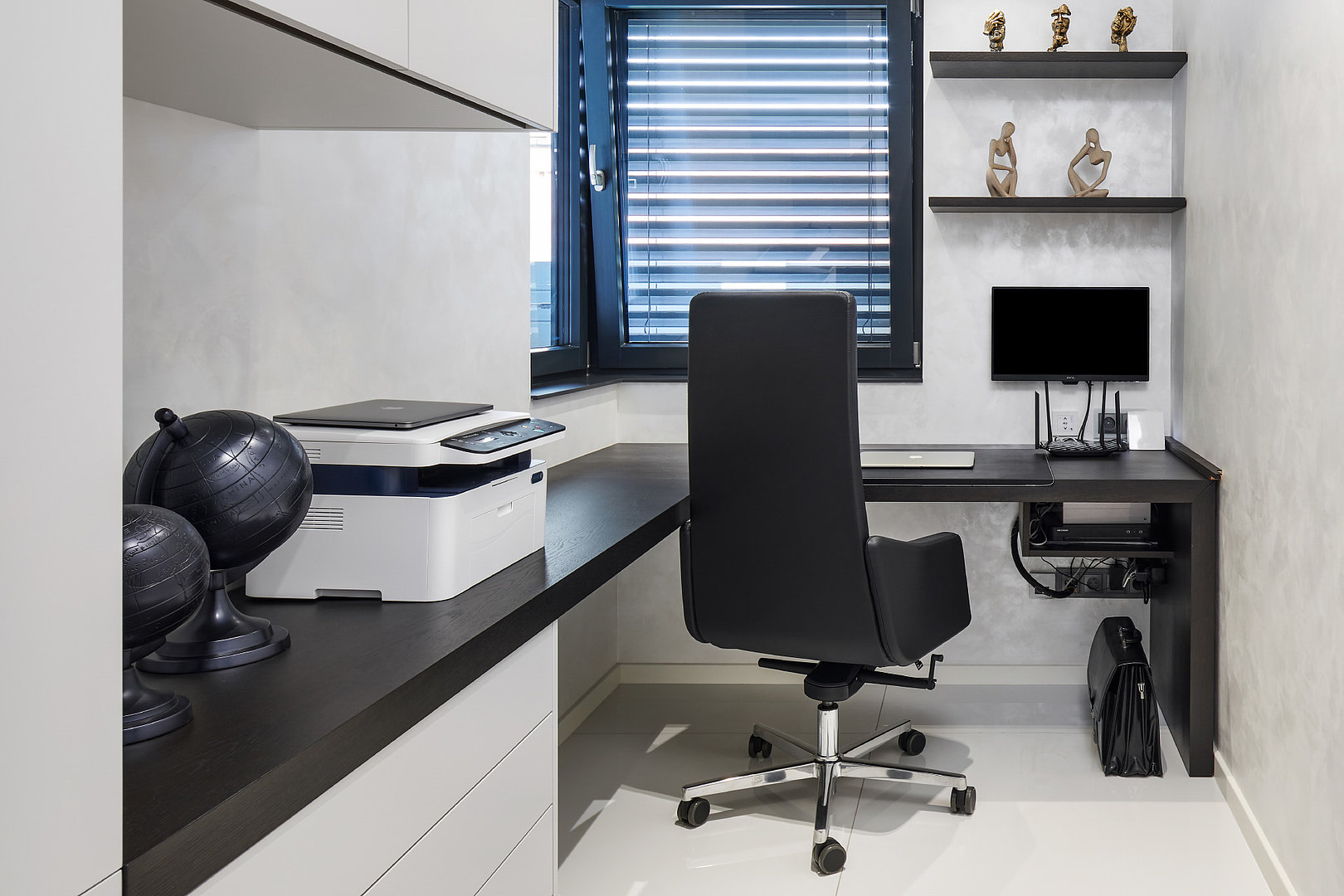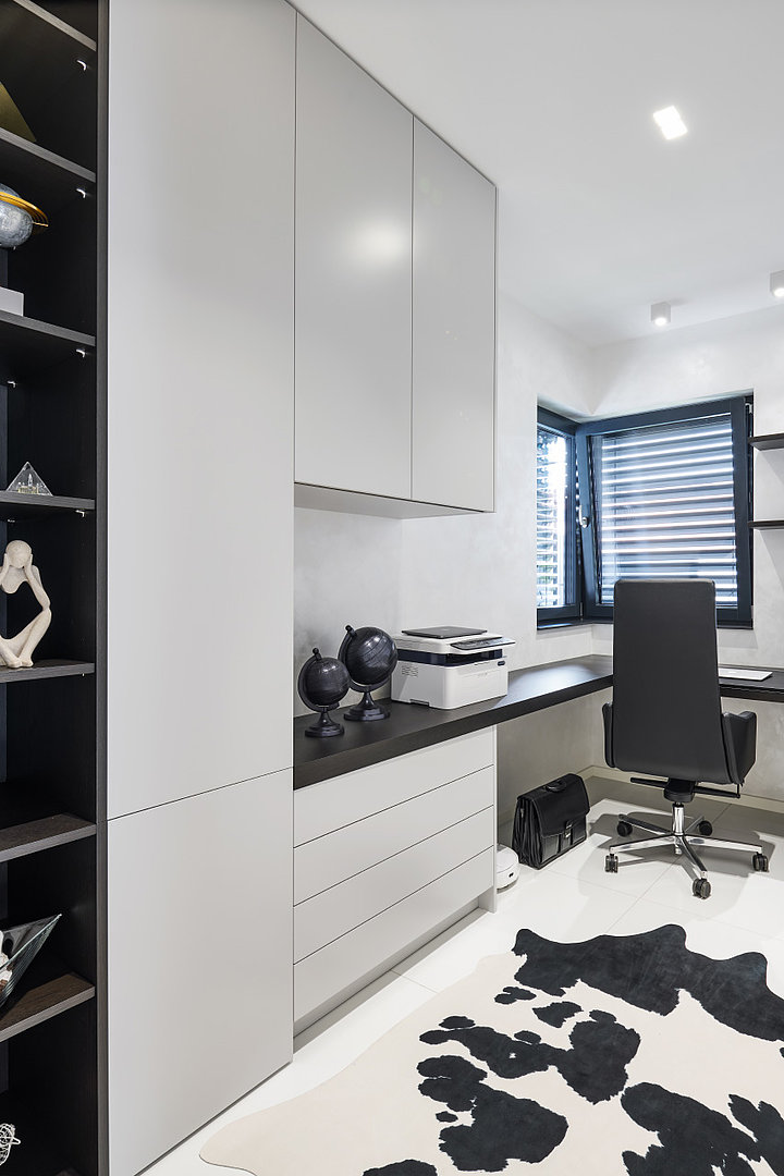 Pracovňa v dvojfarebnej variácii, kde vládne prísny poriadok. Všetko je skĺbené do posledného detailu vrátane dekorácií a doplnkov.