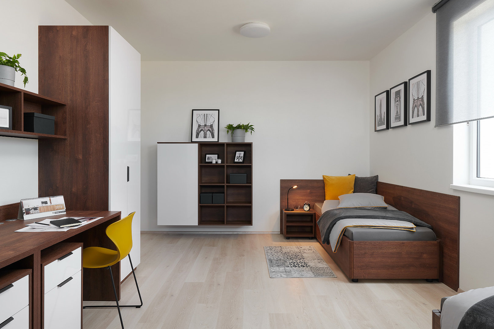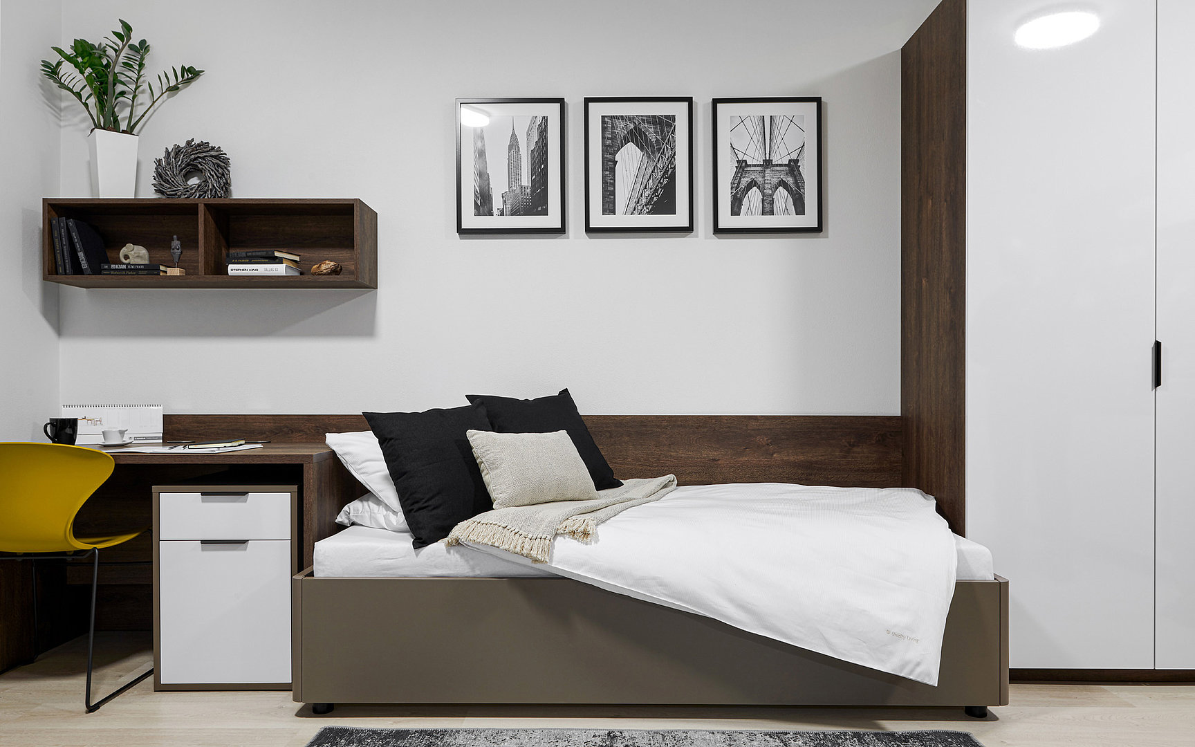Praktické a komfortné riešenie bývania pre študentov. Jednoduchý a čistý dizajn podčiarkuje nadčasovosť celého priestoru.