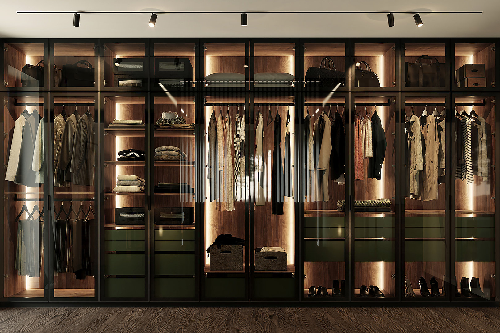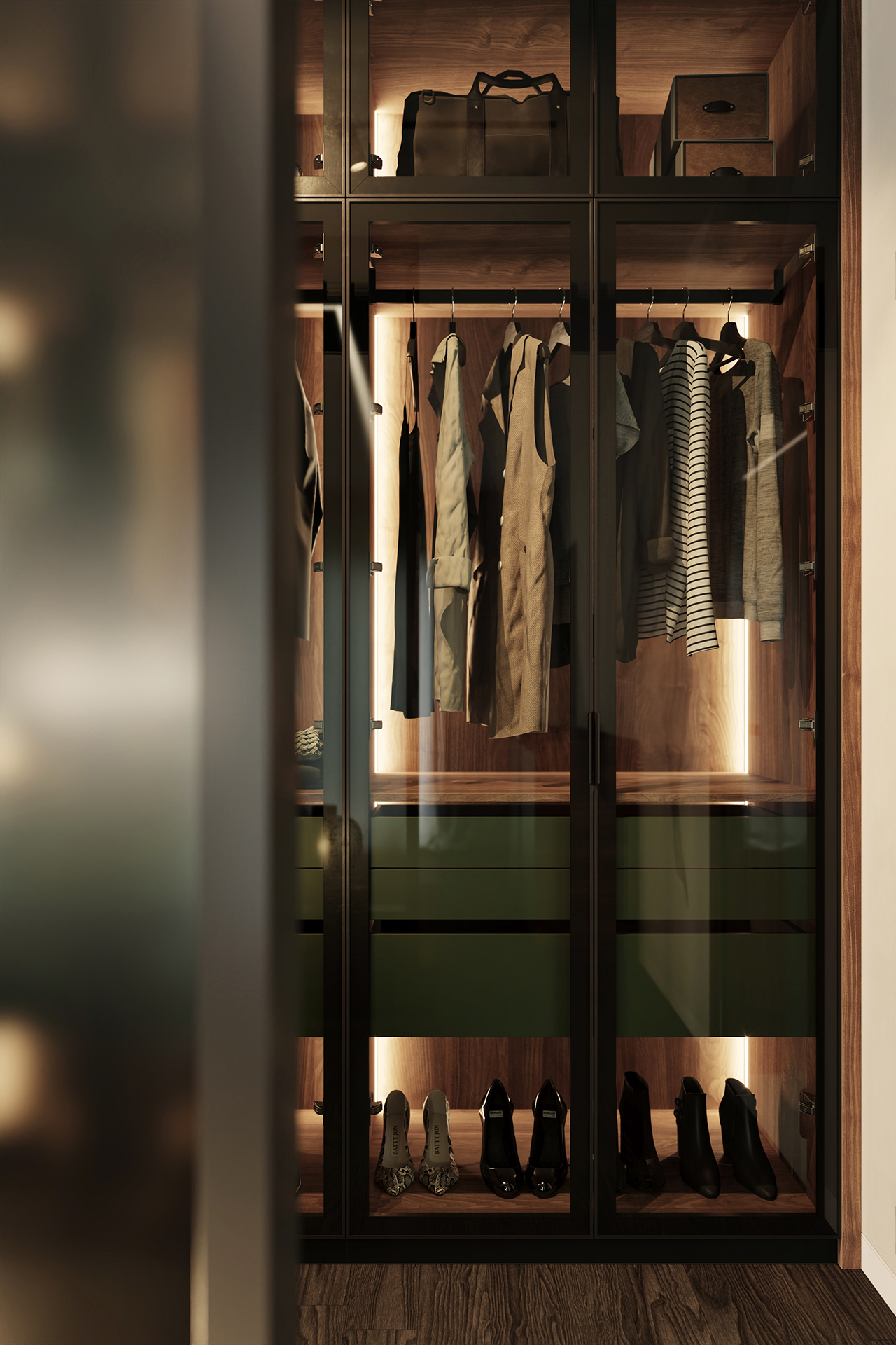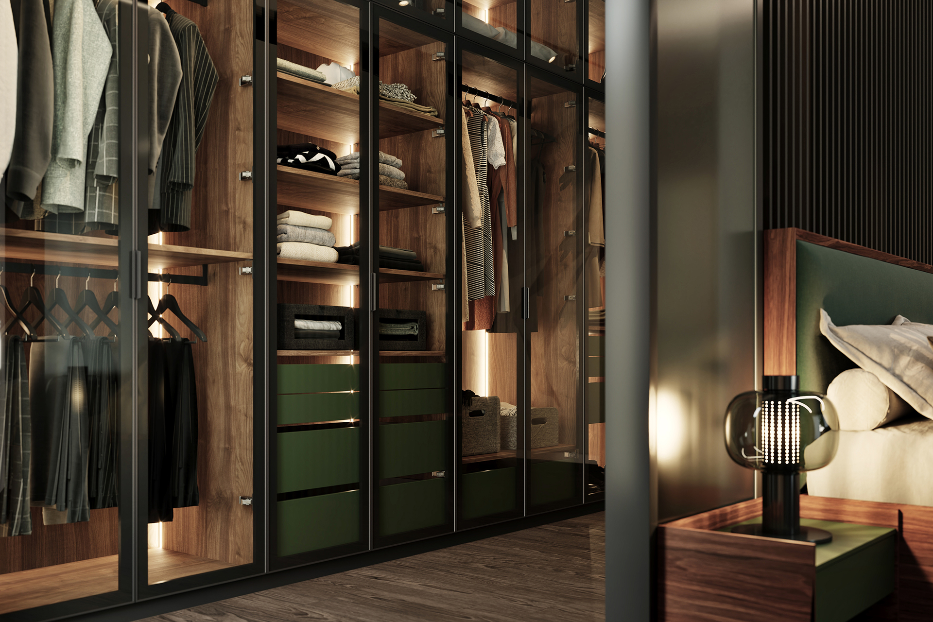Model šatníkovej skrine SKY sa vyznačuje kovovým rámom a sklenenými dverami vrátane variabilného usporiadania vnútorného priestoru. Obľúbenou povrchovou úpravou vnútorného vybavenia je kombinácia prírodnej dyhy a laku.