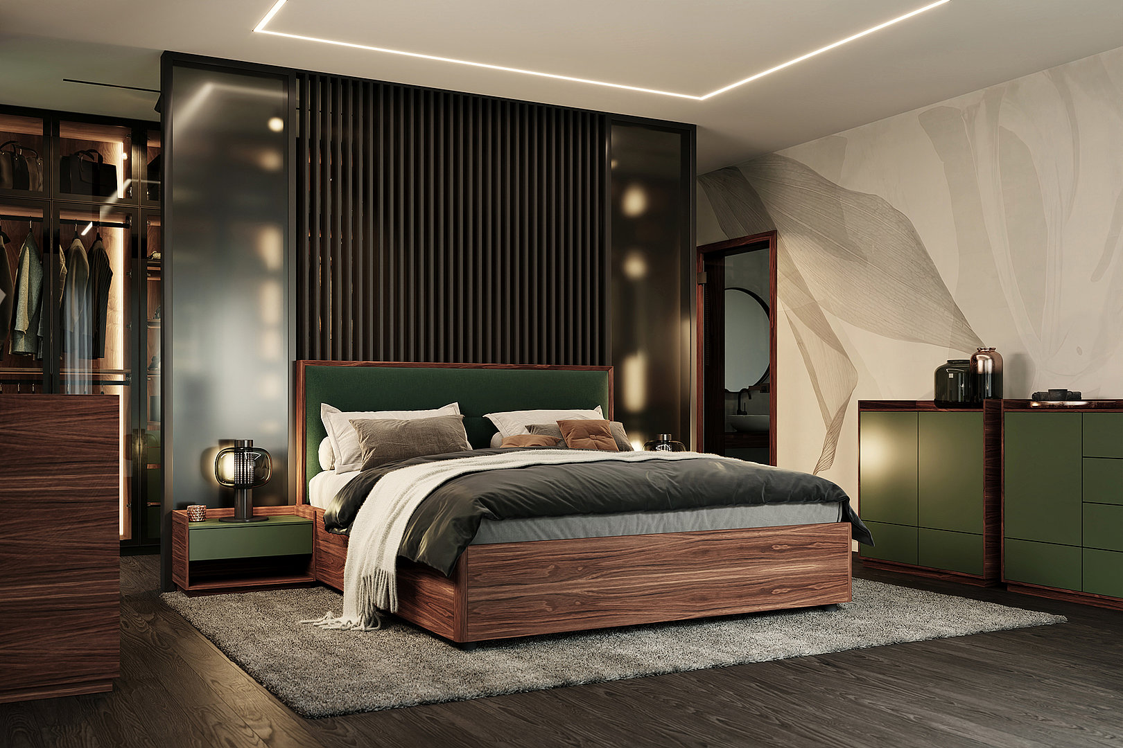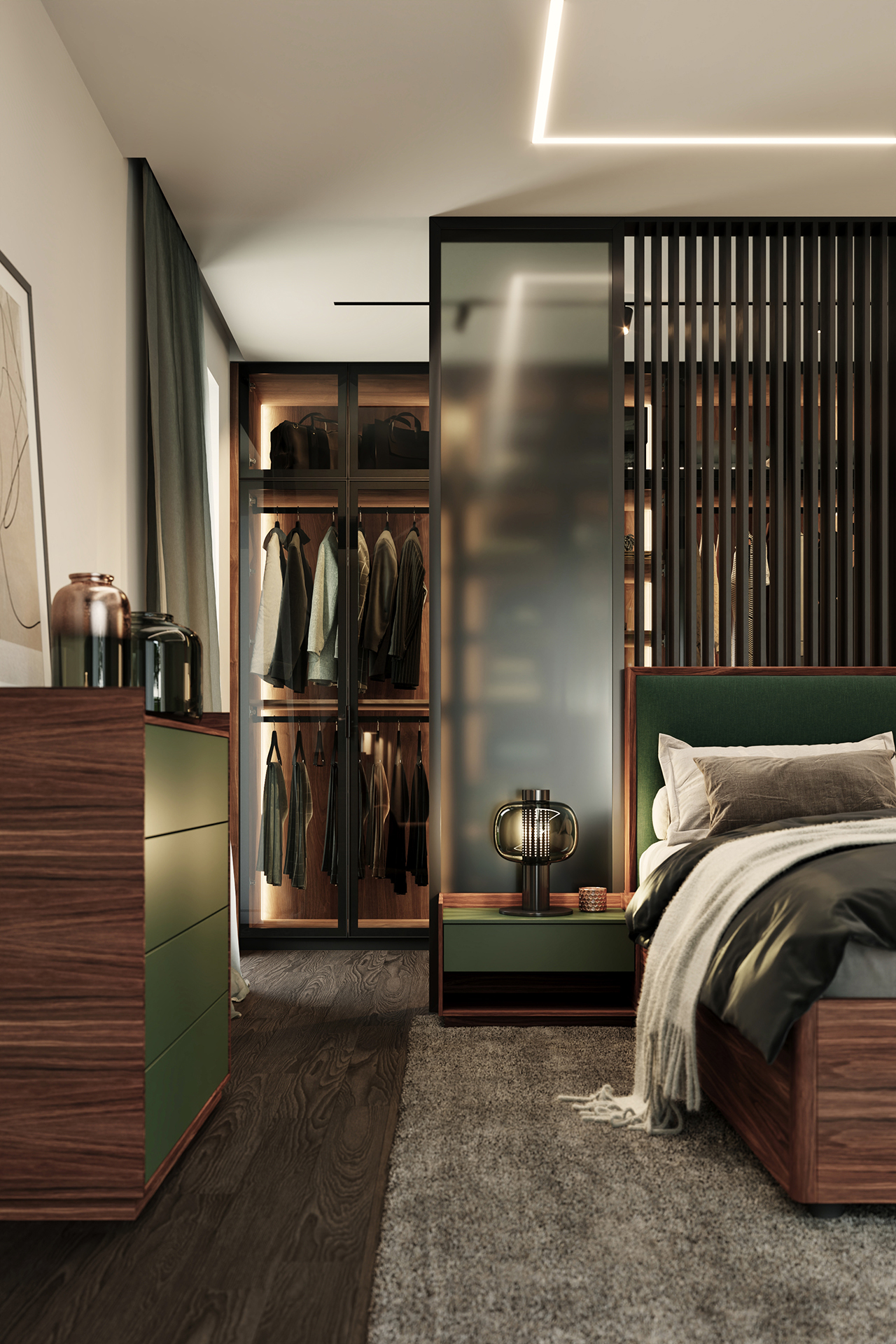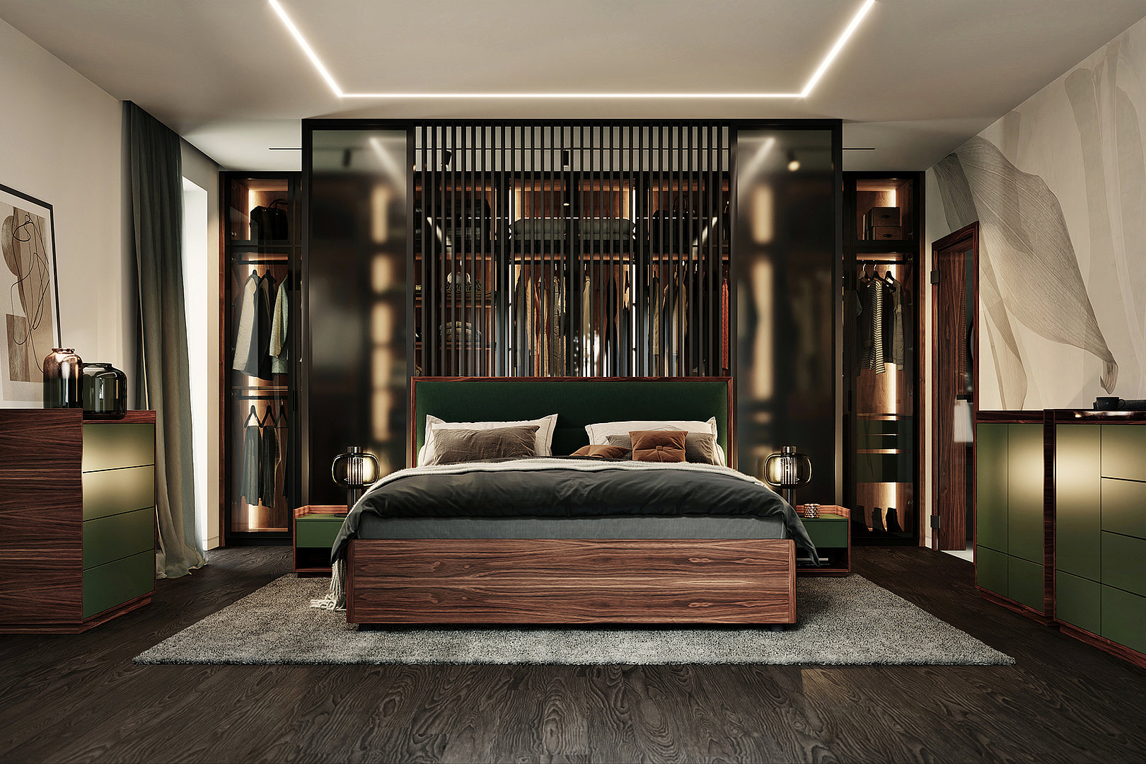 Model šatníkovej skrine SKY sa vyznačuje kovovým rámom a sklenenými dverami vrátane variabilného usporiadania vnútorného priestoru. Obľúbenou povrchovou úpravou vnútorného vybavenia je kombinácia prírodnej dyhy a laku.