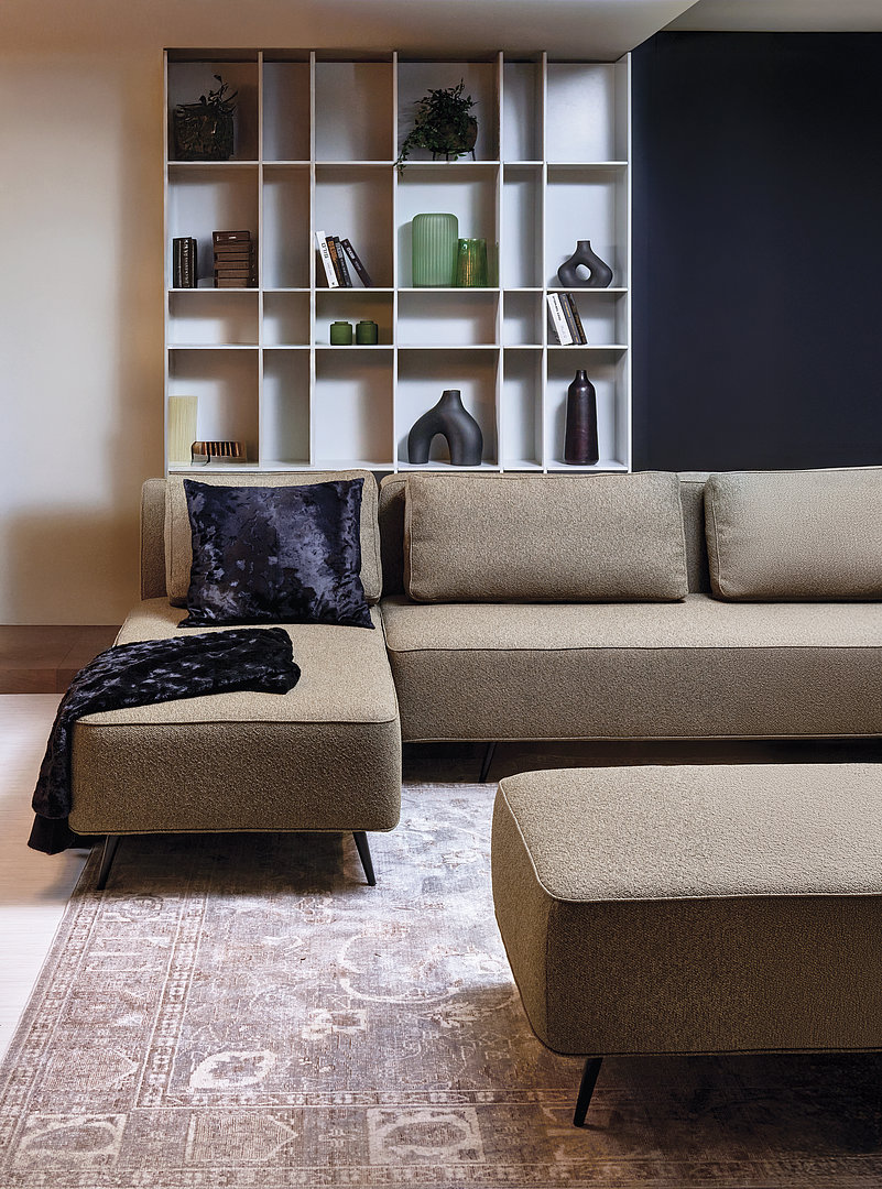 Systém AIR môžete mať ako klasickú rovnú pohovku alebo ho môžete rozšíriť o rohový modul. Celú súpravu potom môžete doplniť taburetkou, ktorá je k dispozícii v dvoch veľkostiach a dá sa použiť ako podnožka alebo konferenčný stolík.