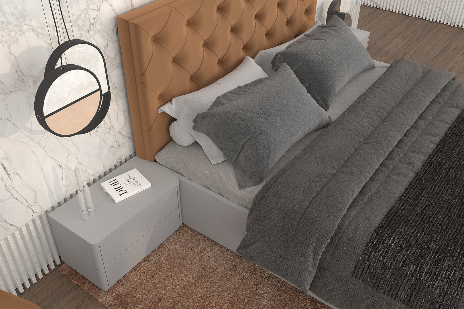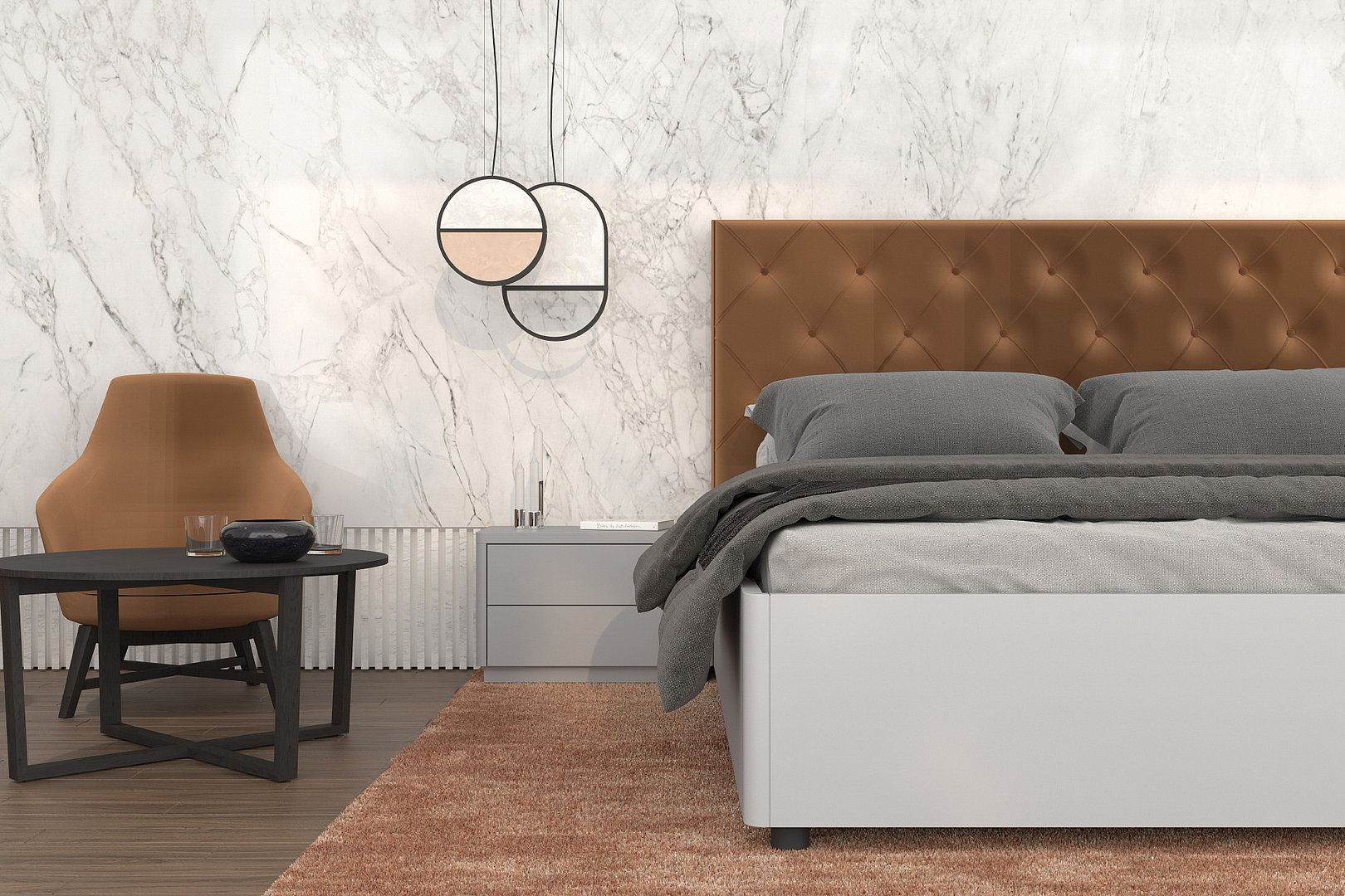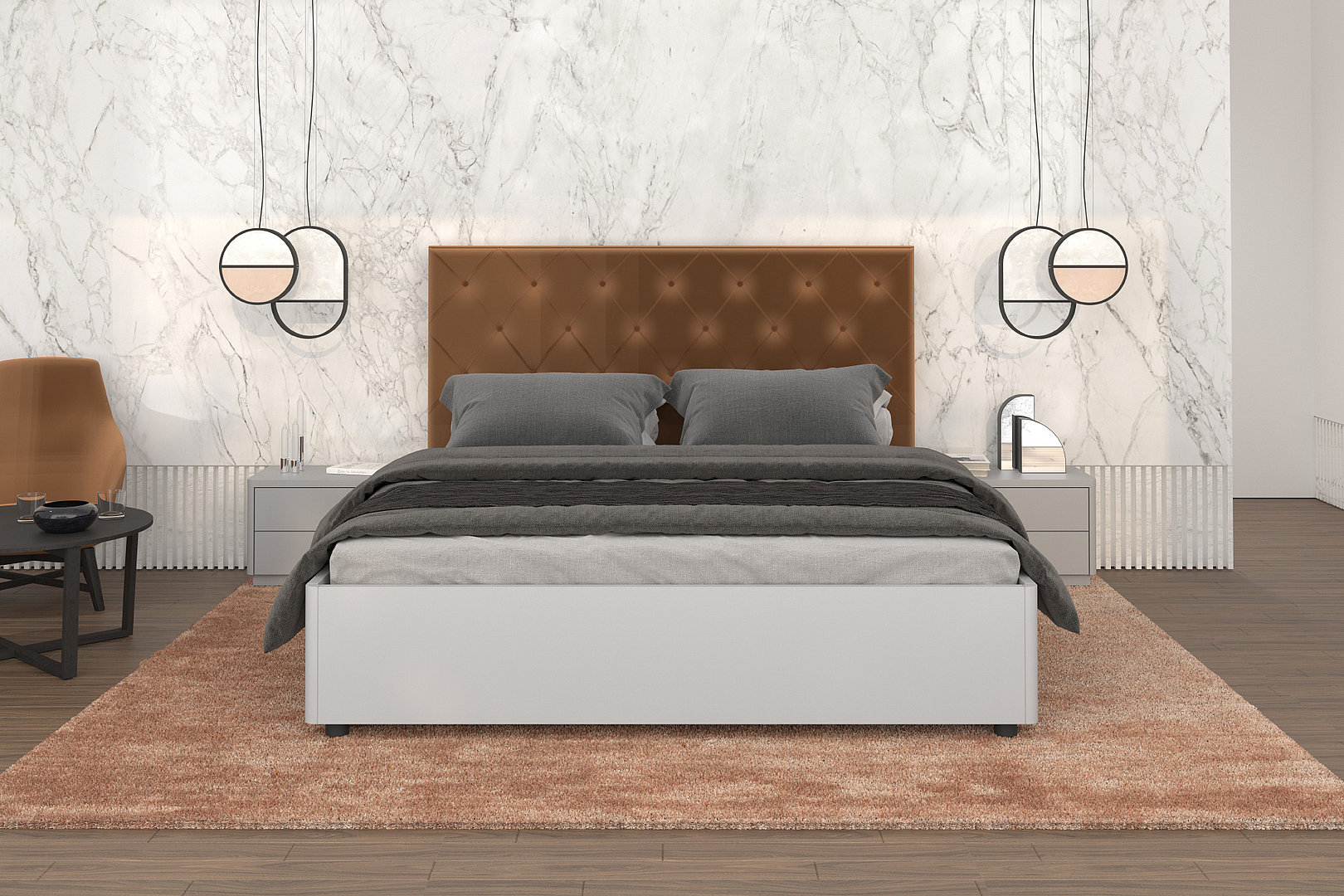 matného svetlosivého laku s čalúnením s hrdzavohnedým odtieňom dokonale ladí.