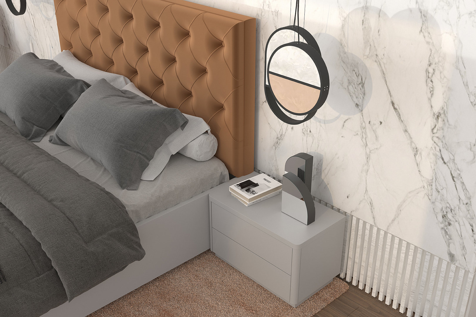 a rám postele sú v rovnakom materiálovom a farebnom vyhotovení vrátane detailov so zaoblením.