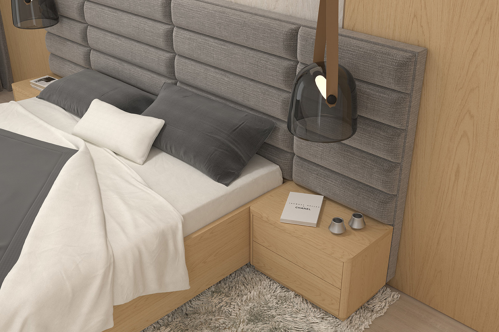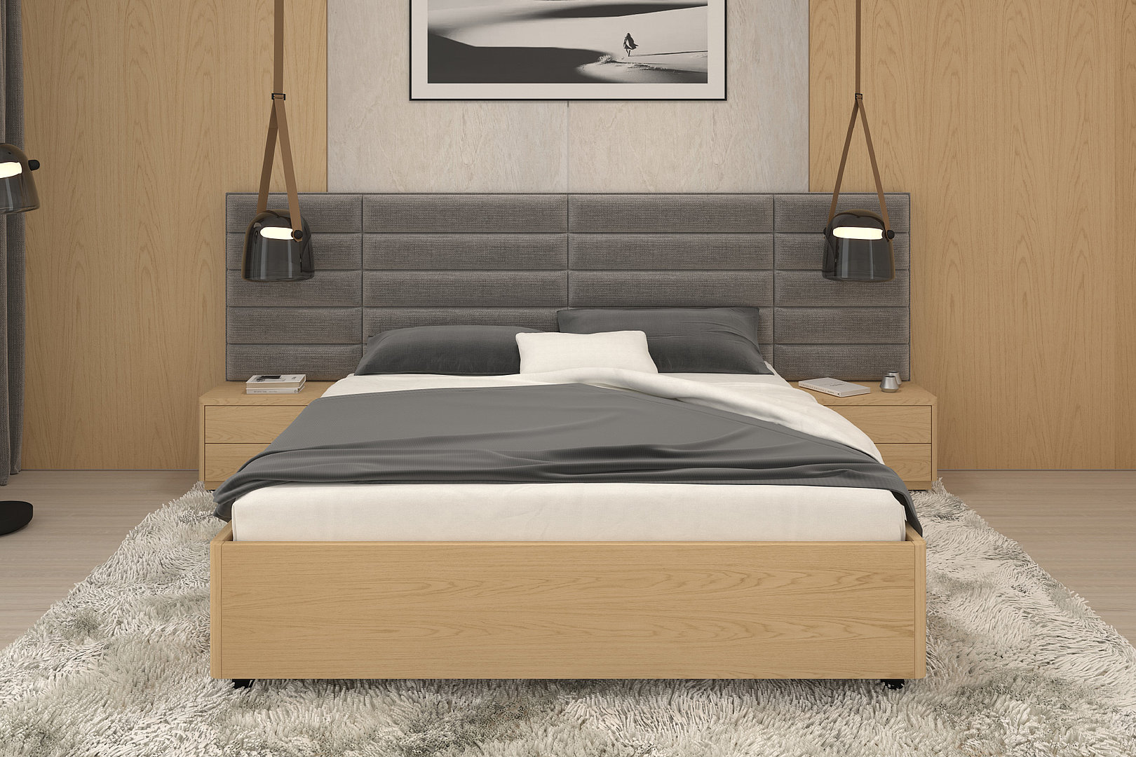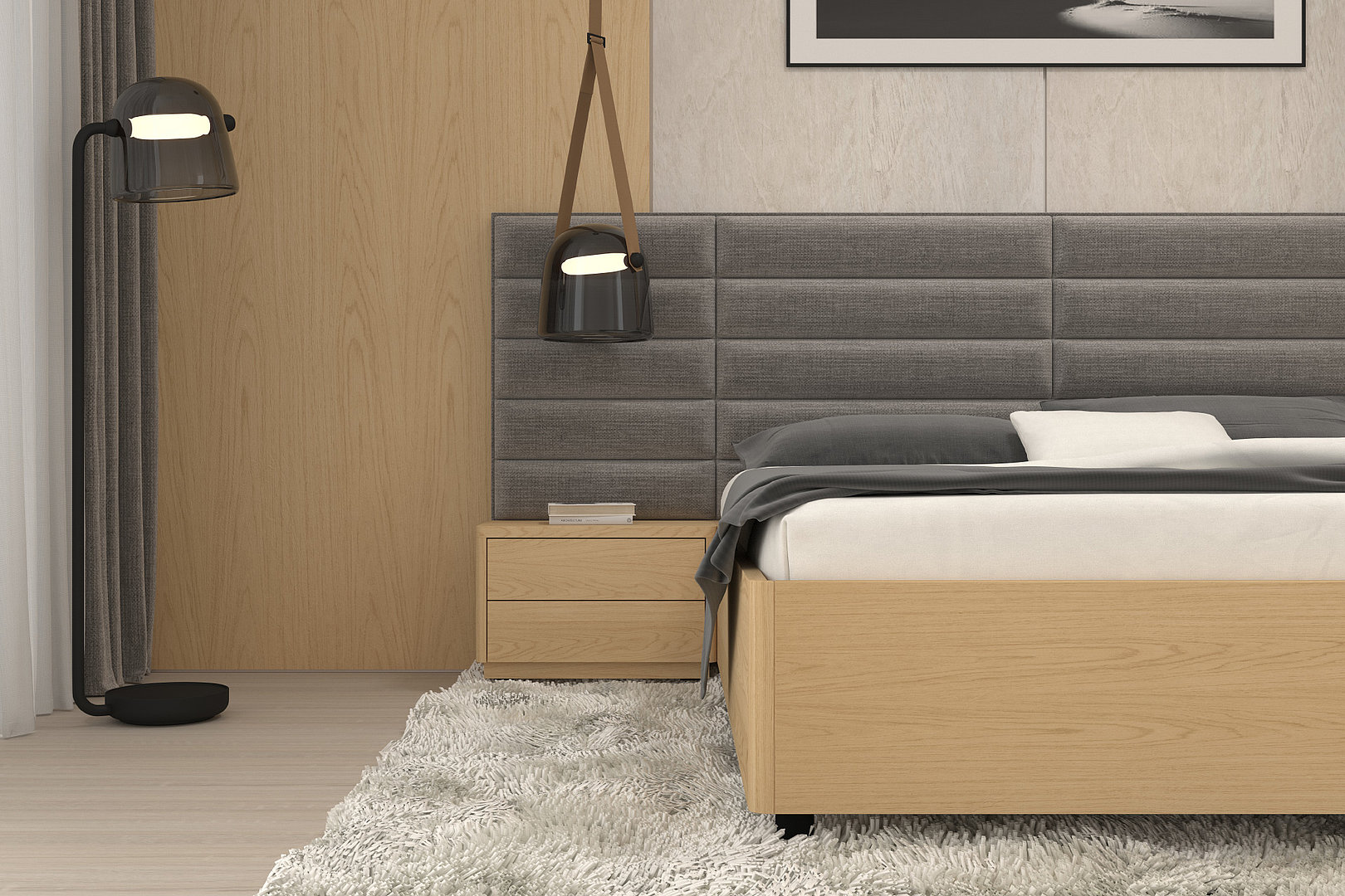 nočných stolíkov, rámu postele aj prešívania čela je zladený do posledného detailu.
