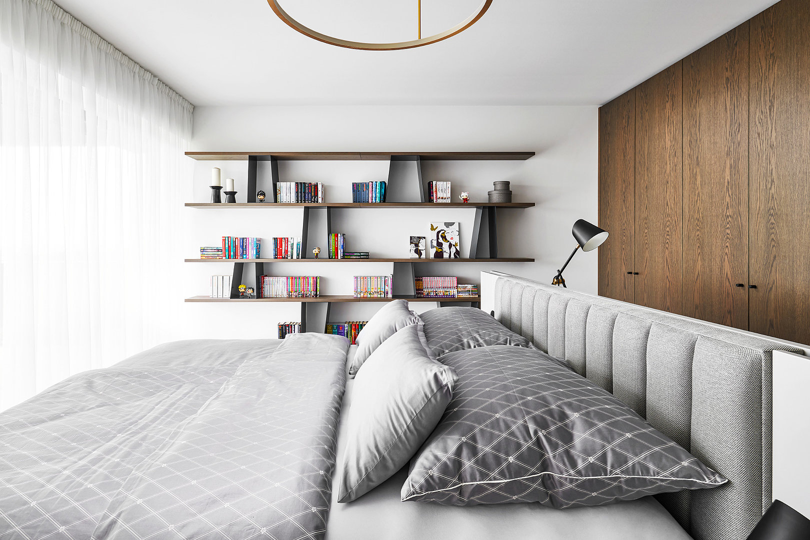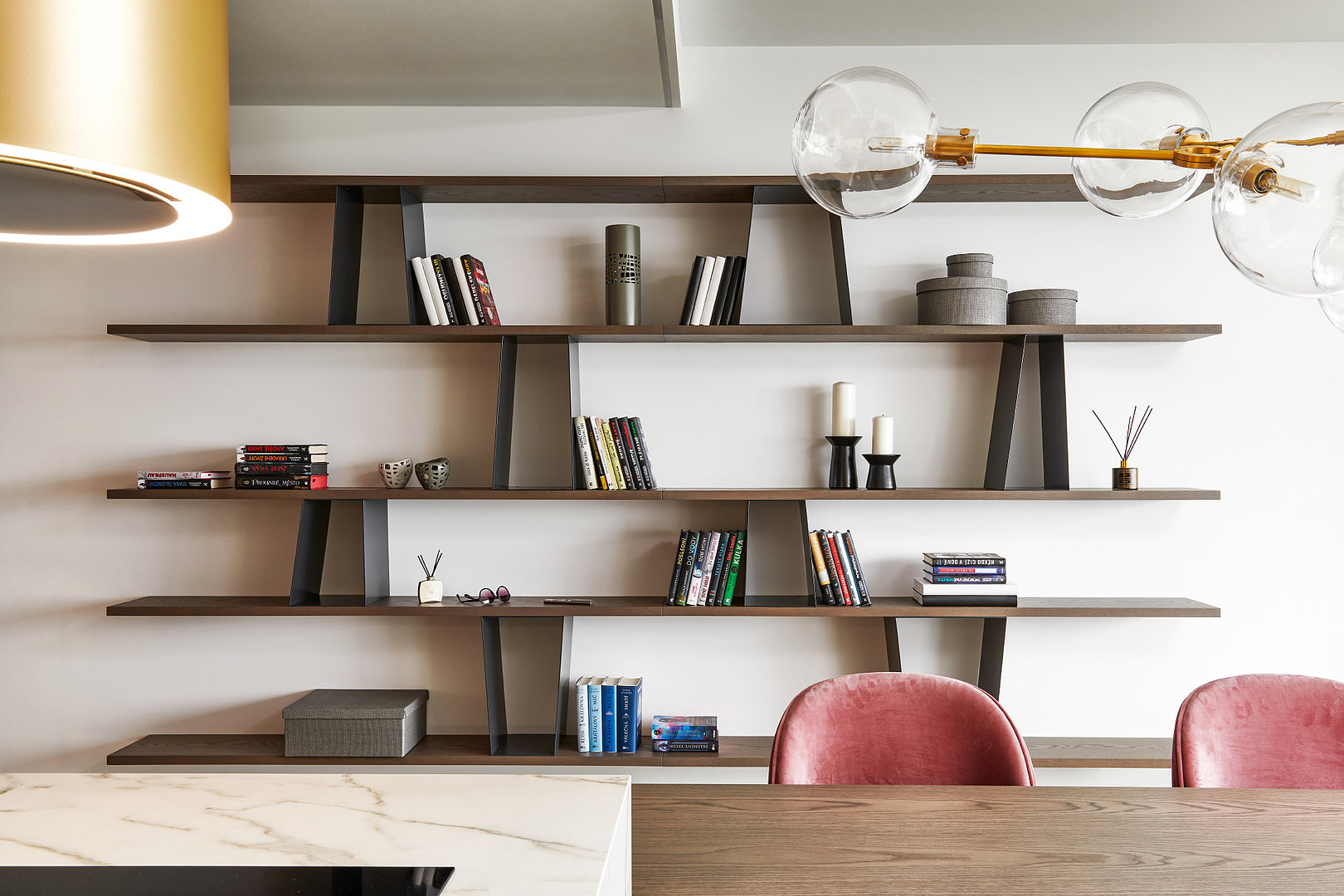 Odľahčená knižnica v kombinácii kovu a dyhy pôsobí v interiéri veľmi elegantne a dizajnovo. Originálne riešenie na mieru.