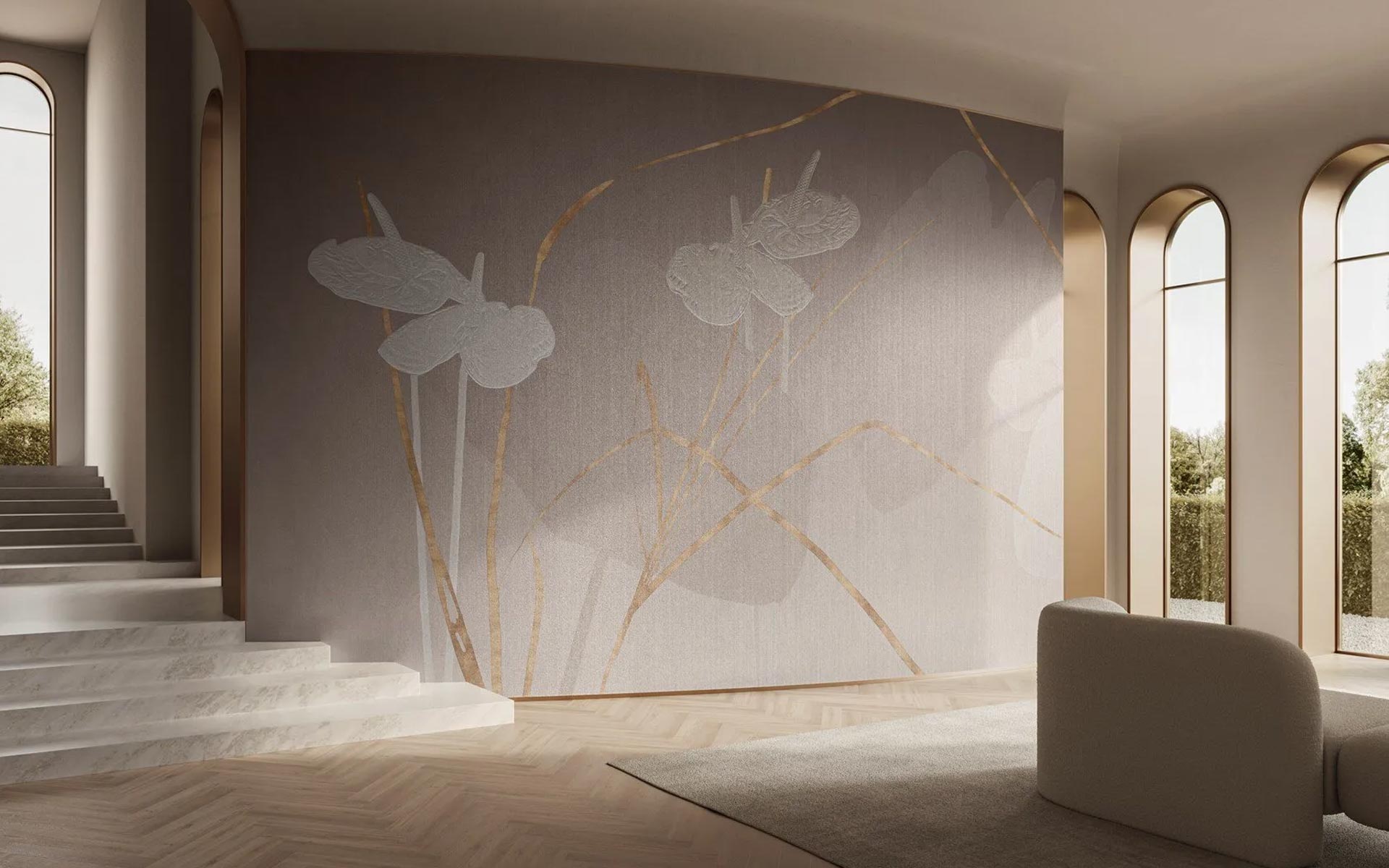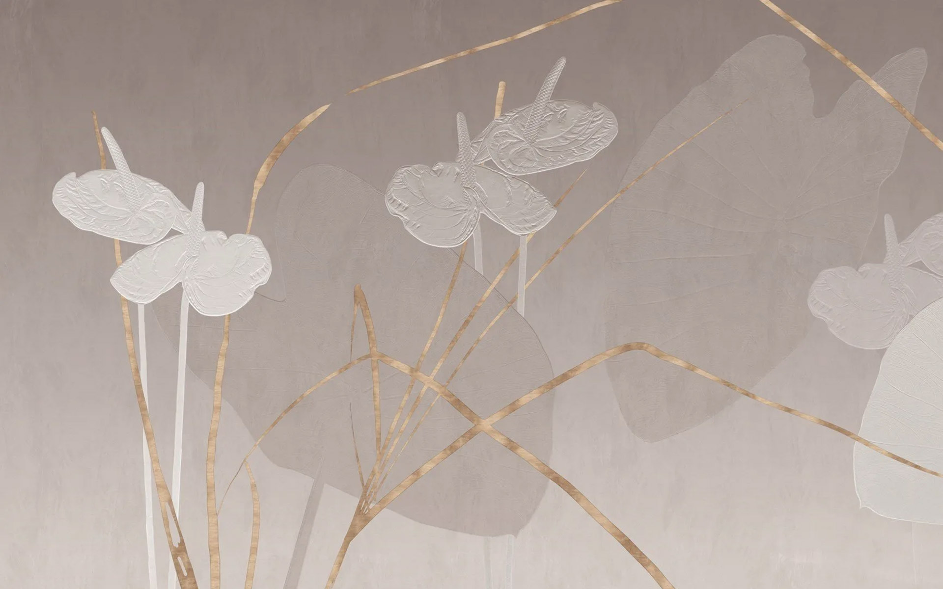 Odvážné tvary květů anthurie, vyobrazené v teplém odstínu bílé. Vznášejí se jako motýli mezi stébly zlaté trávy.