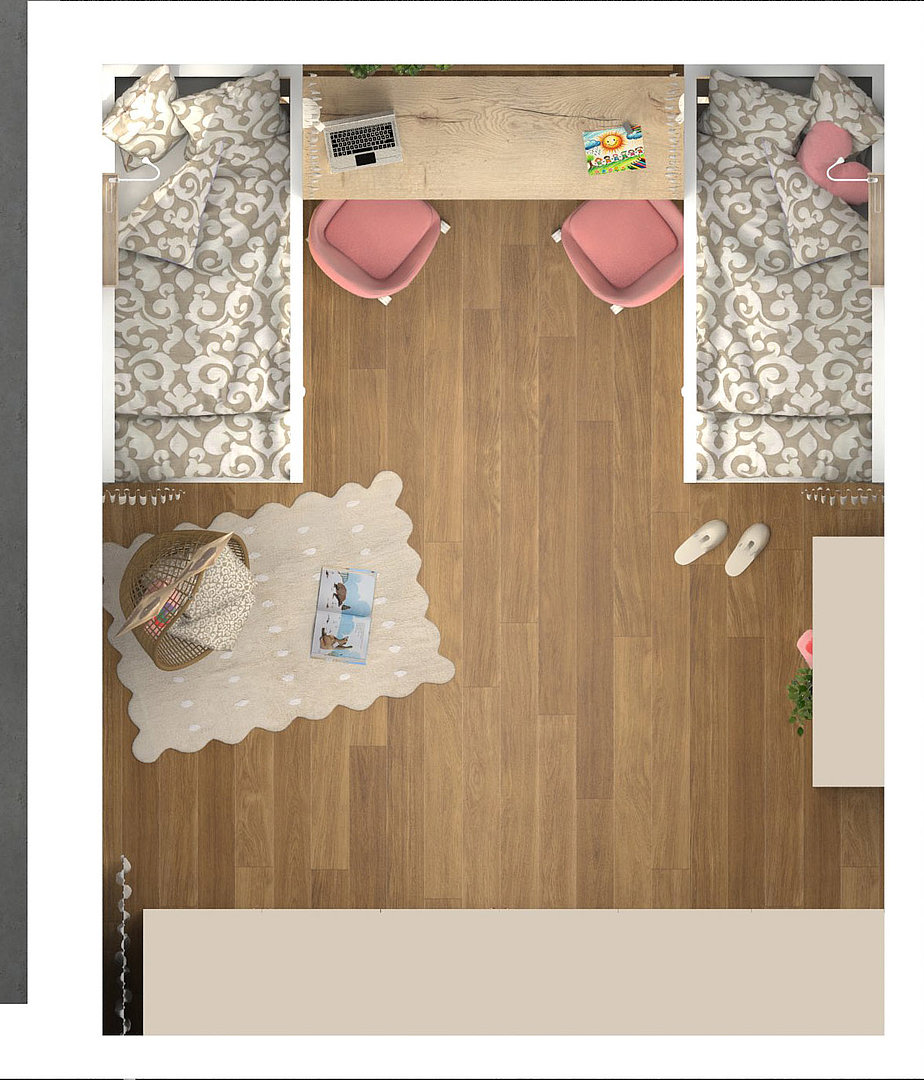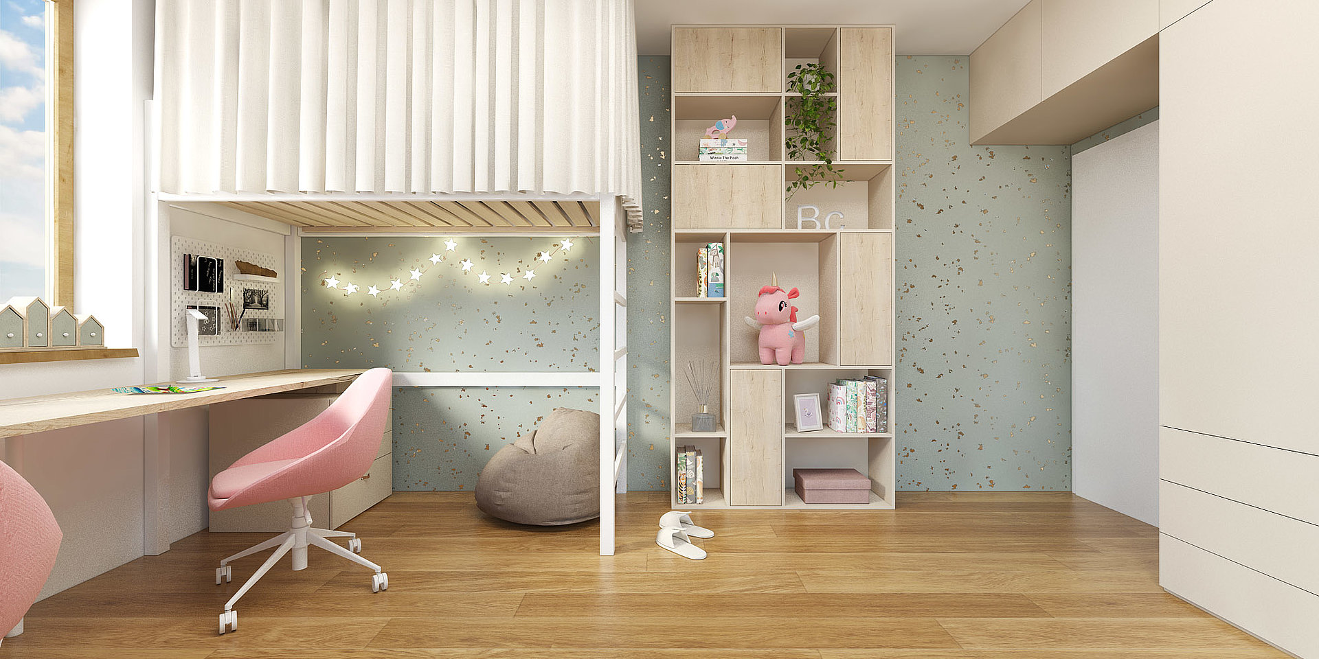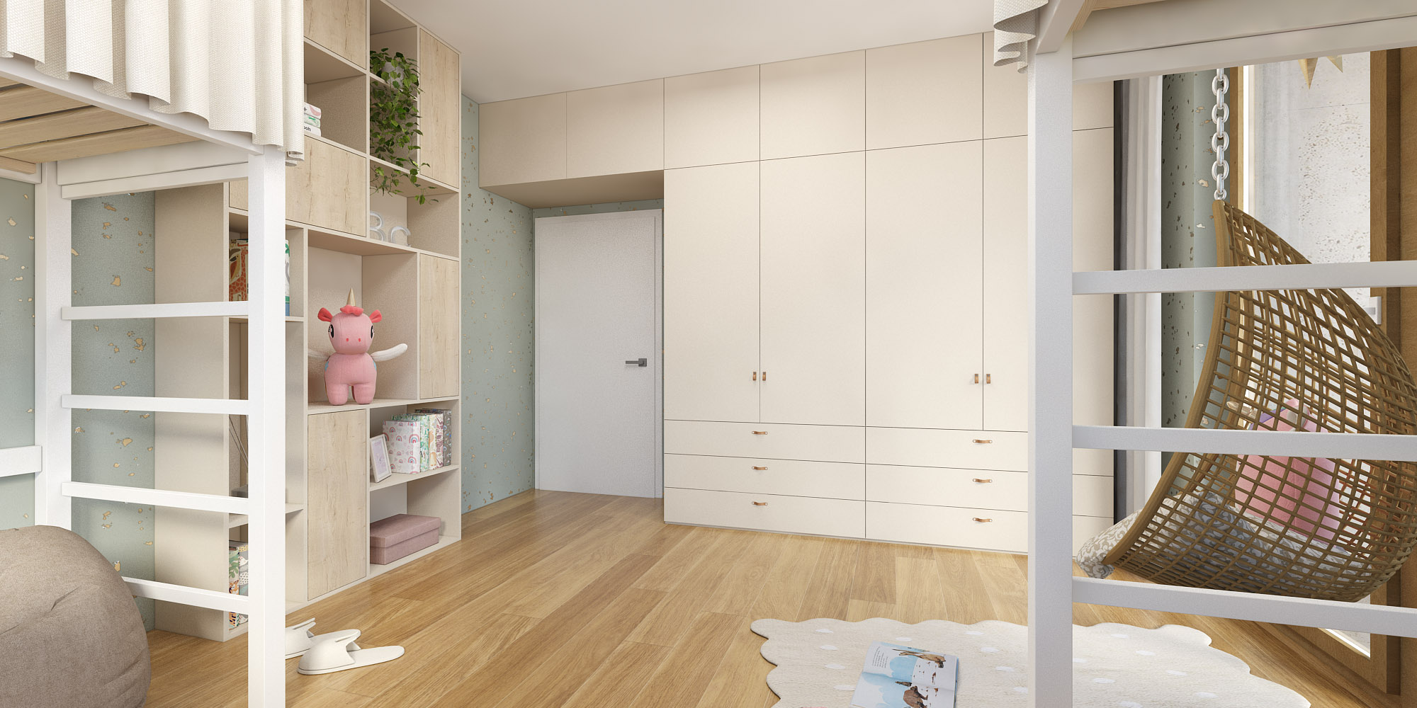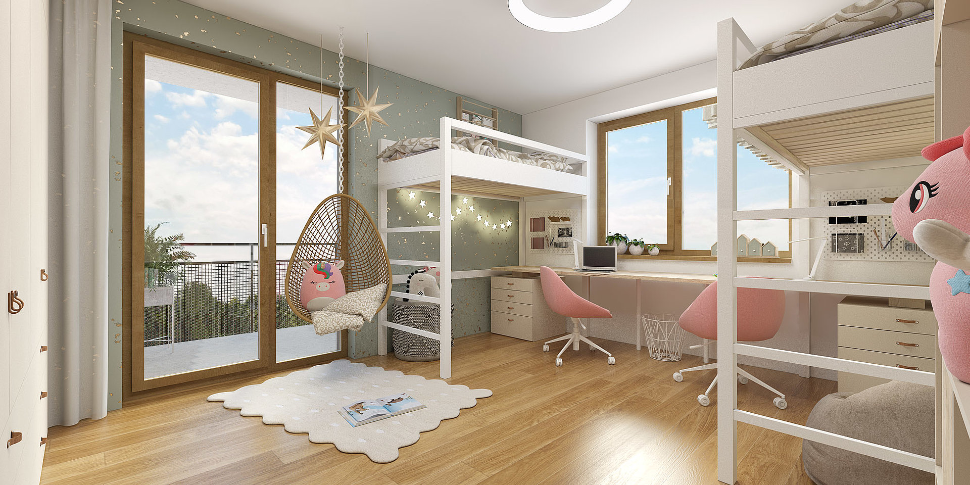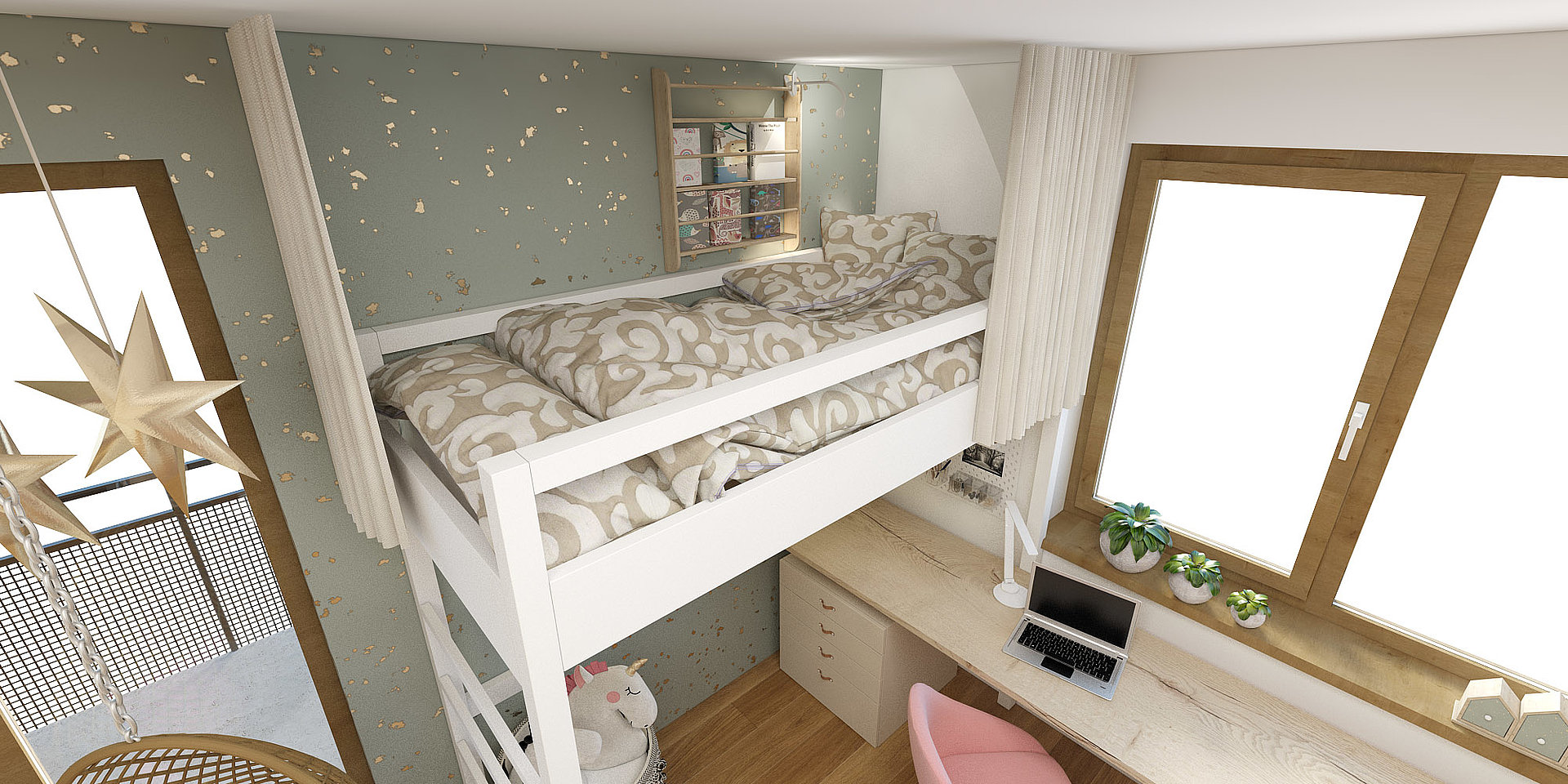 Táto vizualizácia detskej izby bola navrhnutá pre dve malé slečny s dôrazom na vzdušnosť, svetlo a hravú eleganciu. Dominantným prvkom je veľká šatníková skriňa OPTIMA v prevedení laminát Champagne, ktorá ponúka dostatok úložného priestoru a zároveň ladí s celkovým svetlým tónom miestnosti. Dve prakticky riešené poschodové postele maximálne využívajú priestor, bez toho aby ho opticky zaťažovali. Ružovo-zlaté doplnky dodávajú izbe jemný nádych dievčenskej hravosti a vytvárajú útulné prostredie, kde sa dobre spí, hrá aj sníva.