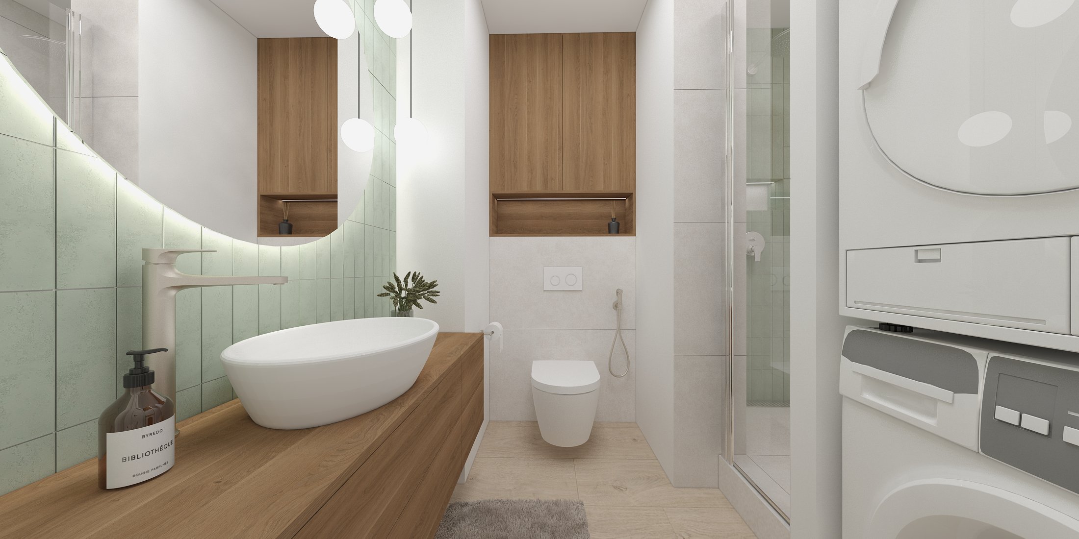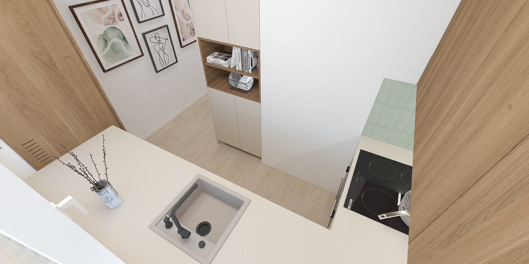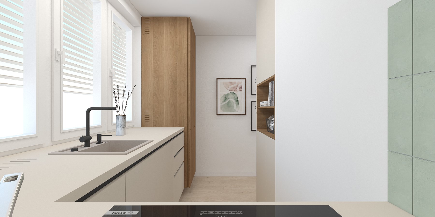 Táto vizualizácia kuchyne a kúpeľne stavia na jemných svetlých tónoch a prírodných materiáloch, ktoré vytvárajú pokojný, vyvážený priestor pre každodenný život.