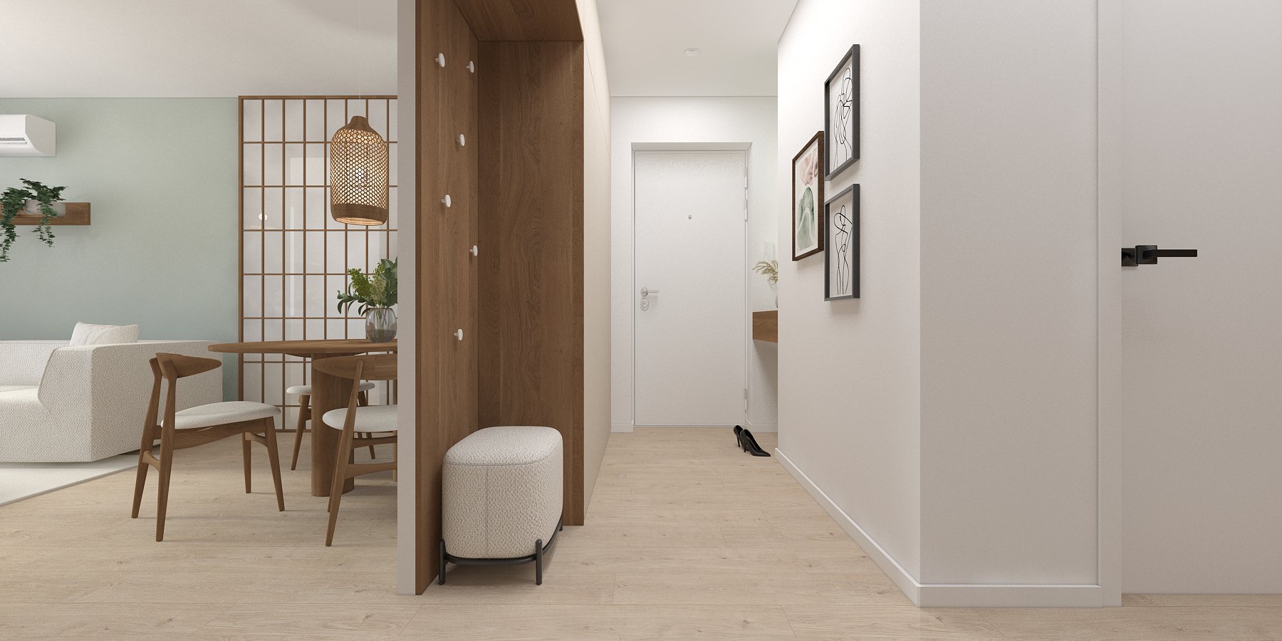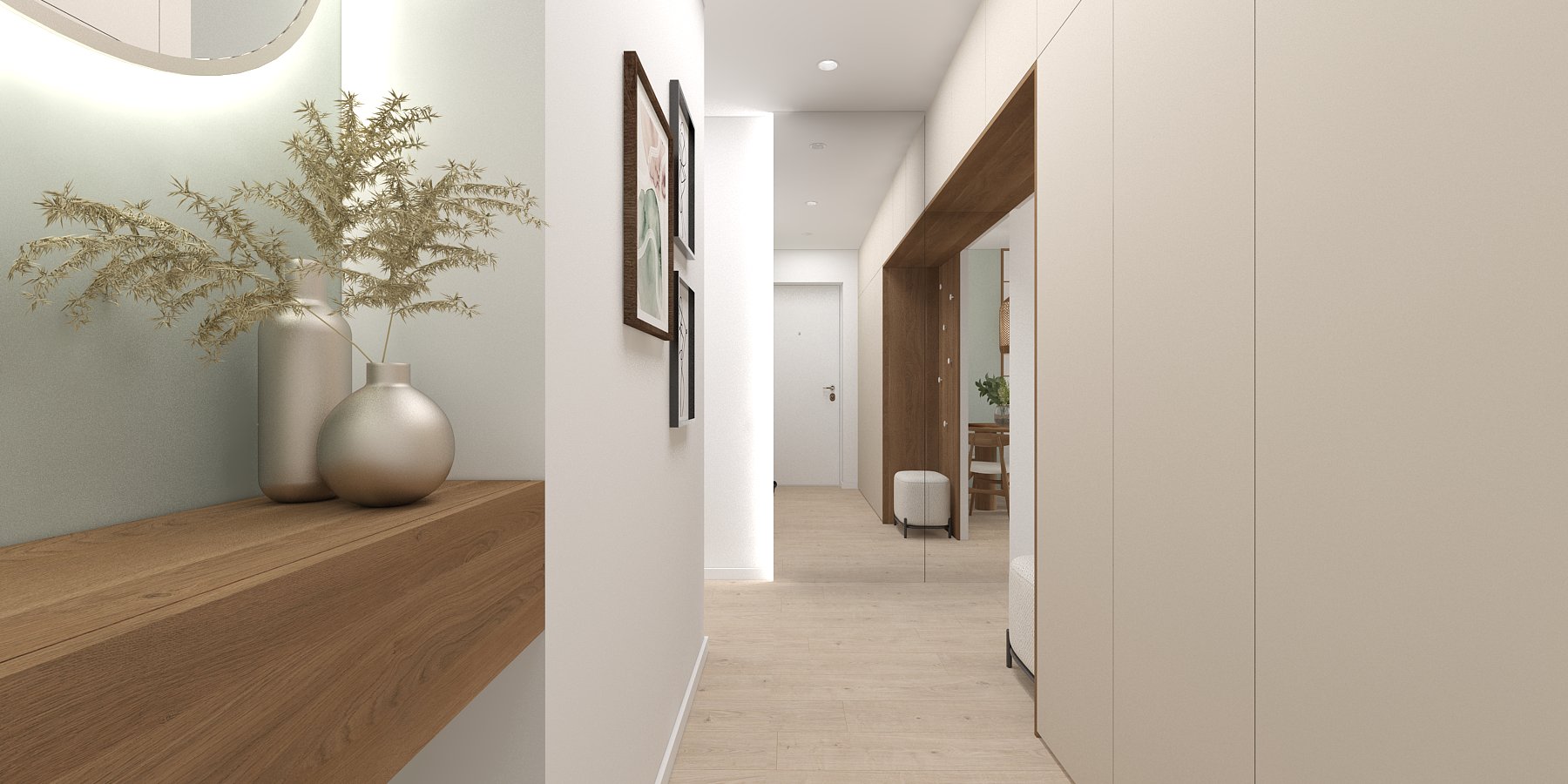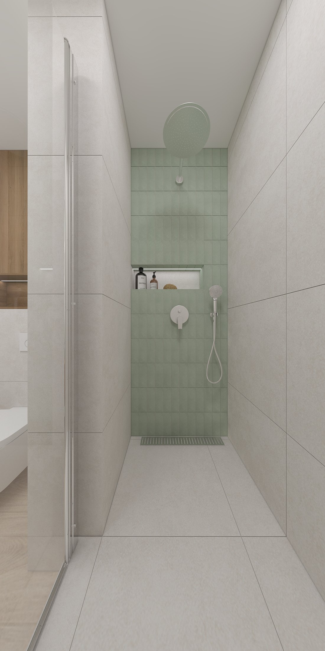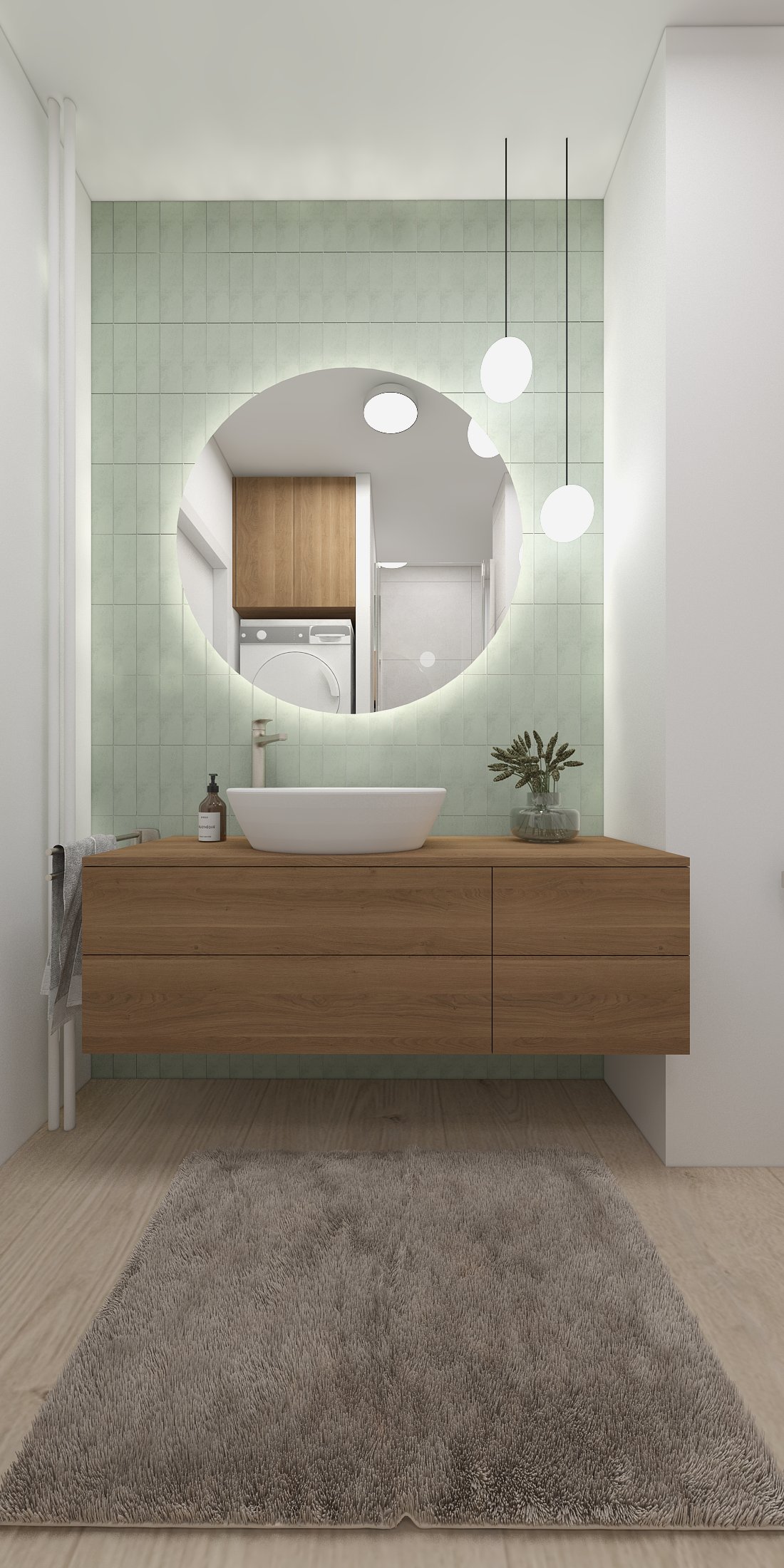Táto vizualizácia kuchyne a kúpeľne stavia na jemných svetlých tónoch a prírodných materiáloch, ktoré vytvárajú pokojný, vyvážený priestor pre každodenný život.