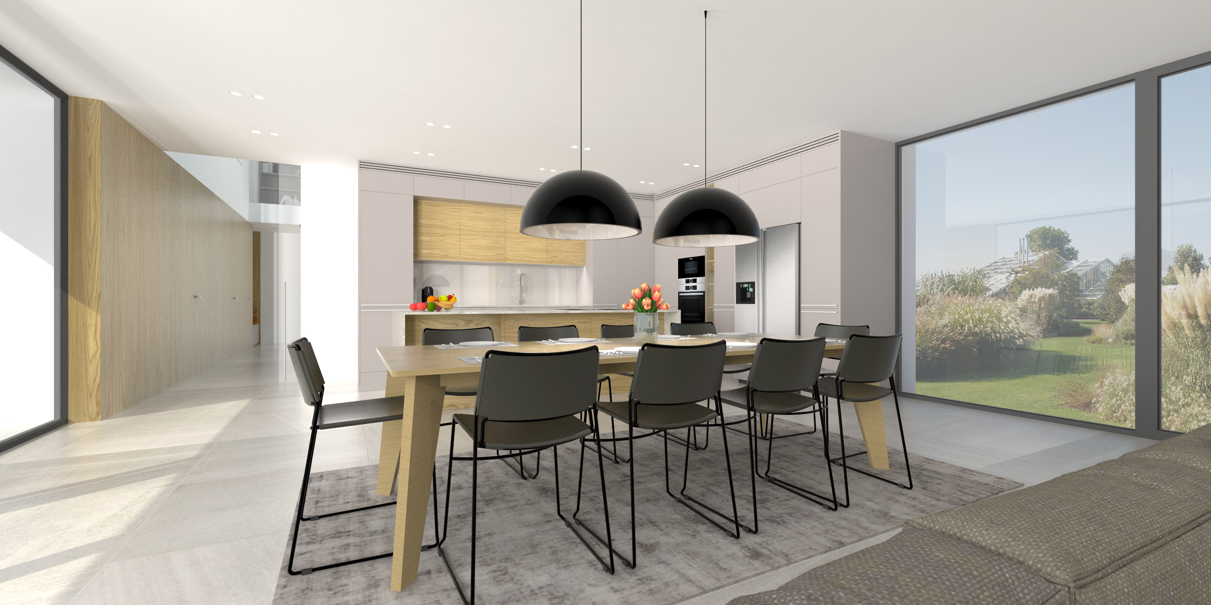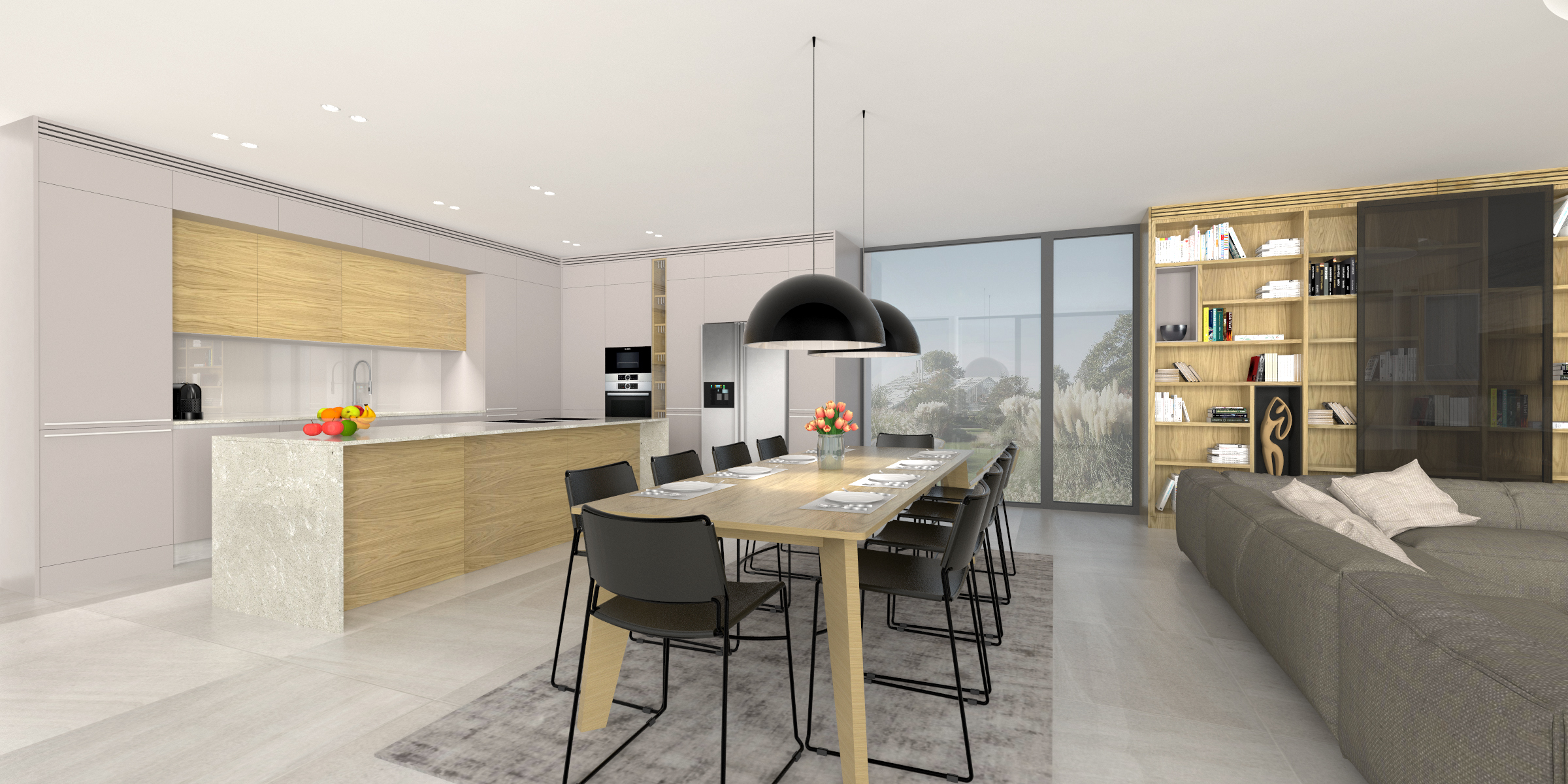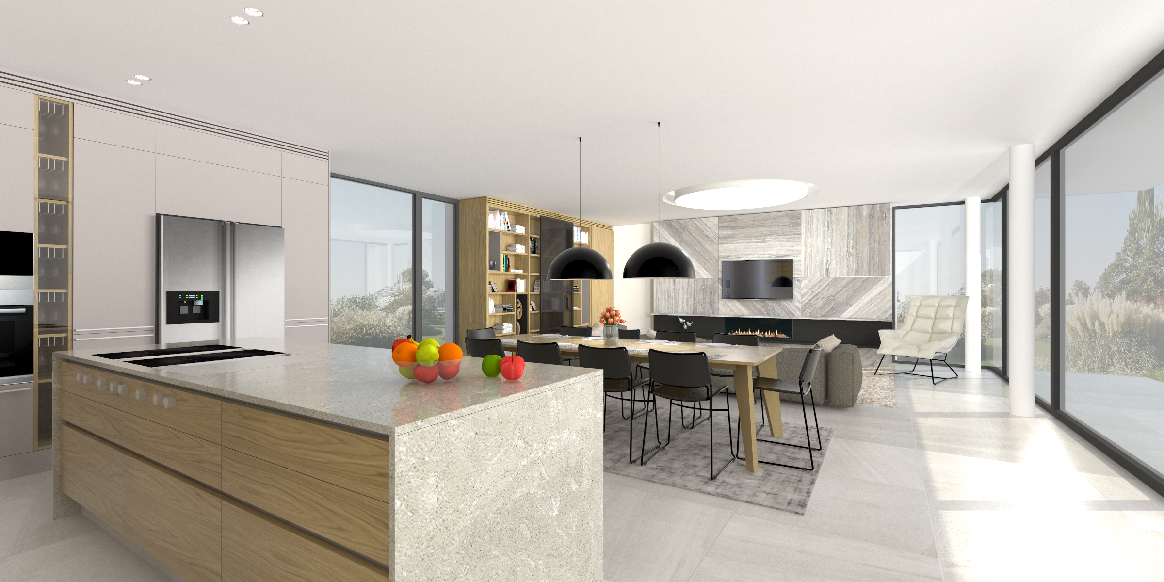 Táto vizualizácia interiéru spája kuchyňu, jedáleň a obývaciu časť do harmonického celku s dôrazom na funkčnosť, prírodné materiály a nadčasový dizajn. Kuchyňa ELITE/LINE v prevedení lak safari mat a dyha dub rustikálny prírodný pôsobí moderne, zároveň však útulne a prirodzene.