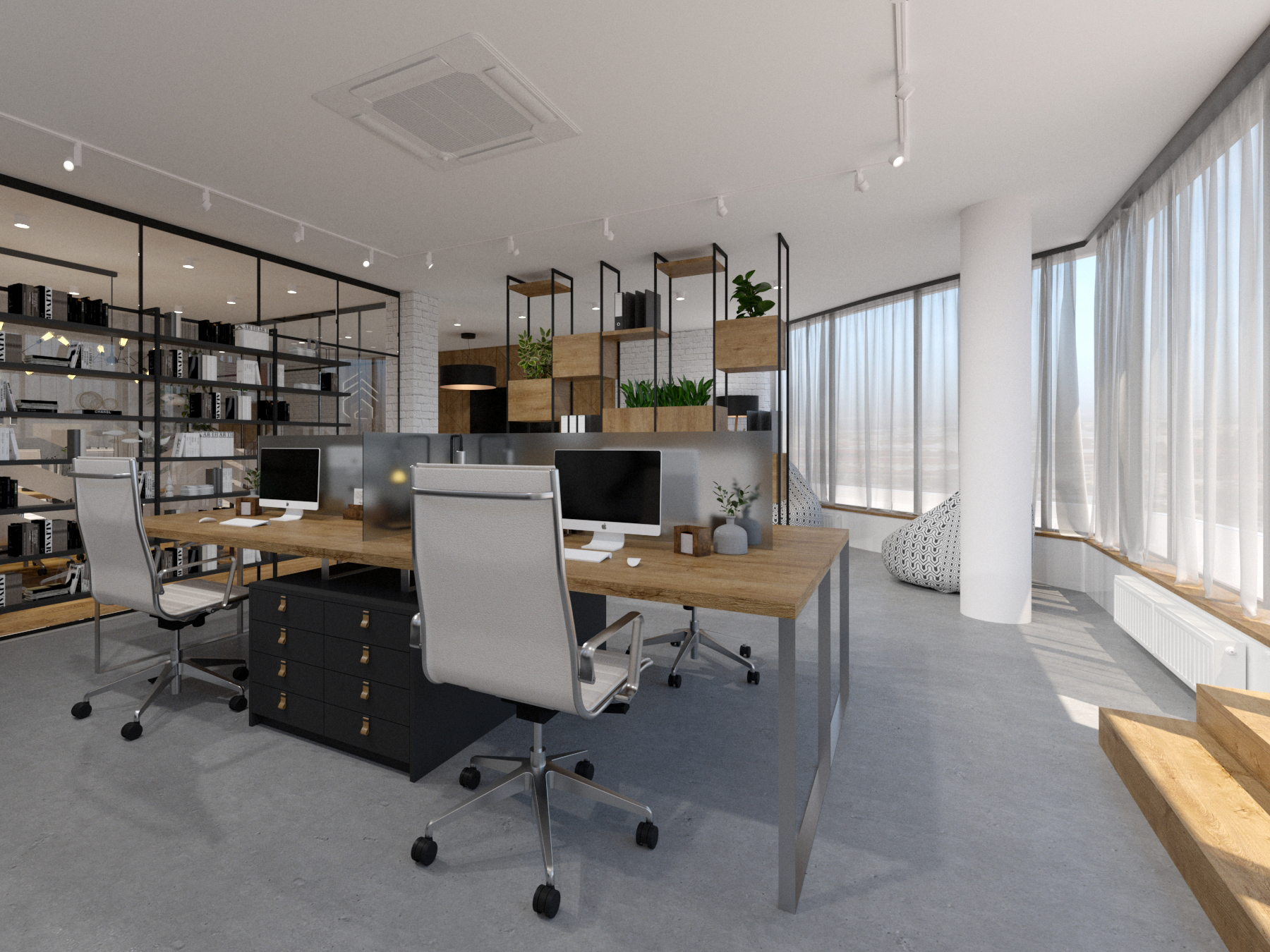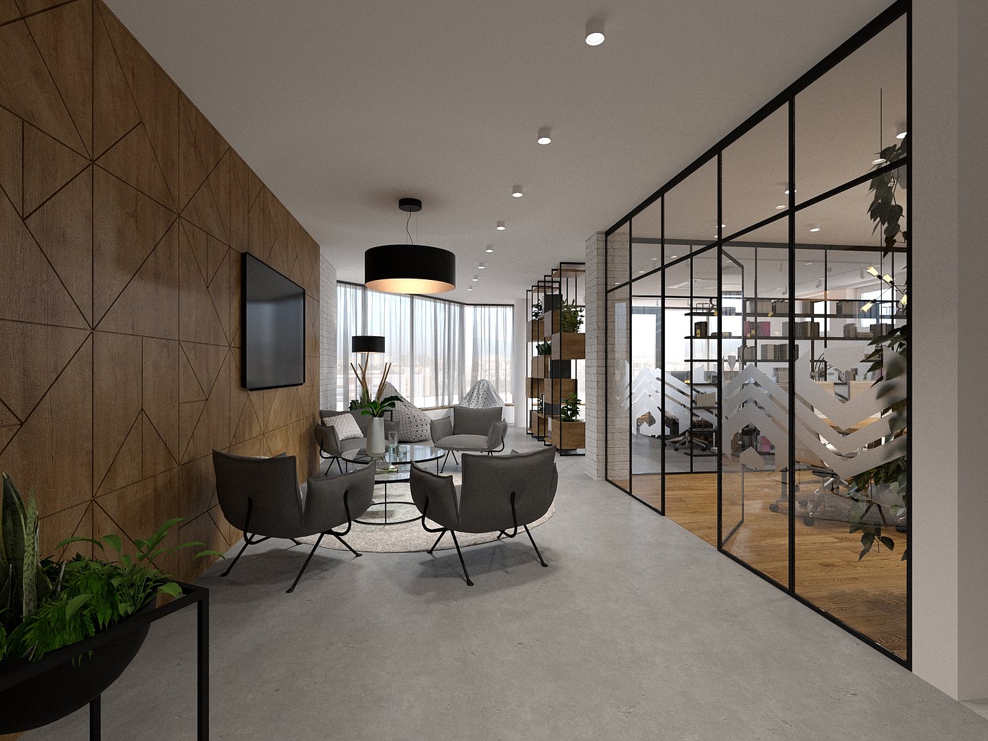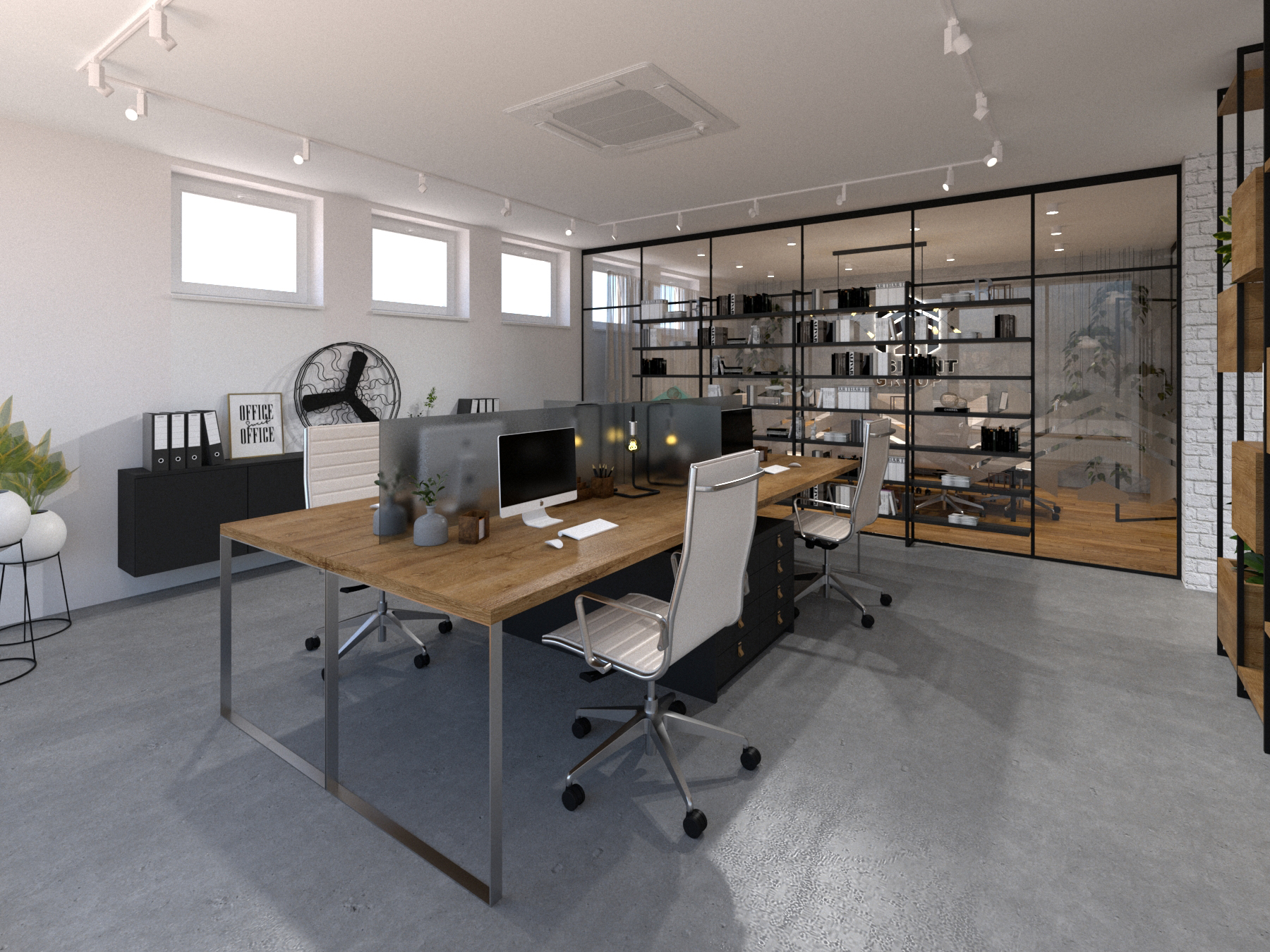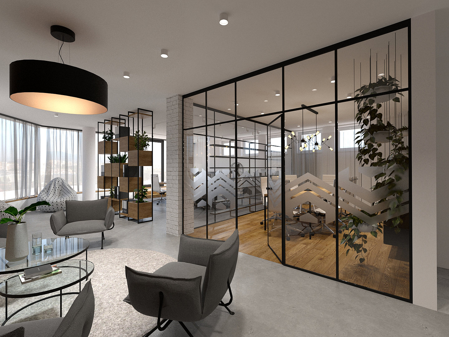 Táto vizualizácia ukazuje, že aj kancelárske priestory môžu byť reprezentatívne a premyslené.